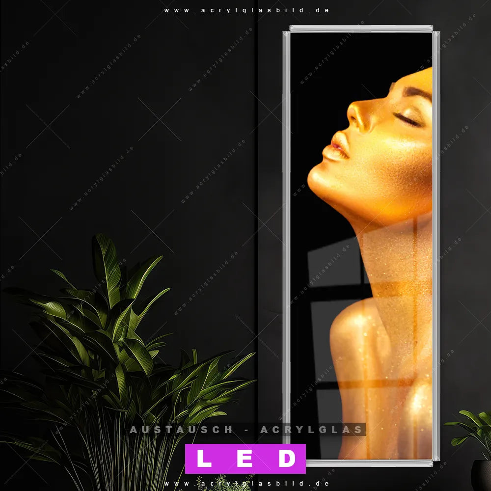 Begriffe wie Frau, Porträt, Erotik, modern, Gold, Farbe, Beauty, Haar, Gesicht, Körper haben dich auf der Suche nach deinem neuen Austausch-Acrylglasbild inspiriert? Dann sollte das Wechsel-Acrylglasbild Goldfrau für dein bereits vorhandenes LED Acrylglasbild Canvalight® DIA den Weg zu dir finden.