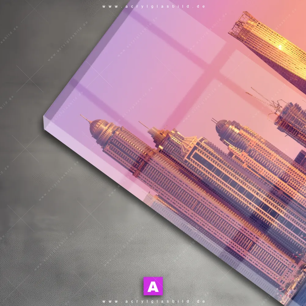 Das Motiv Sonnenaufgang in Dubai wird im UV-Direktdruck in den Farben Gold, Lila, Pink auf die Rückseite einer 5mm starken, transparenten Acrylglasplatte gedruckt. Das durchscheinende Motiv Sonnenaufgang Wolkenkratzer im Natürlich - Realistisch, Modern Art Stil wird anschließend vollflächig mit einer weißen Schicht hinterlegt. Das Architektur - Gebäude, Städte - Skylines Acrylglasbild | Quadrat erhält so eine bemerkenswerte Farbbrillanz, hohe Schärfe und erstaunliche Tiefenwirkung.