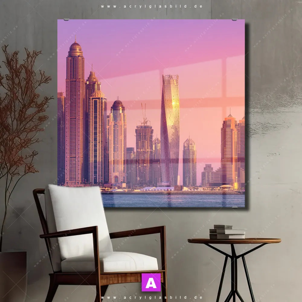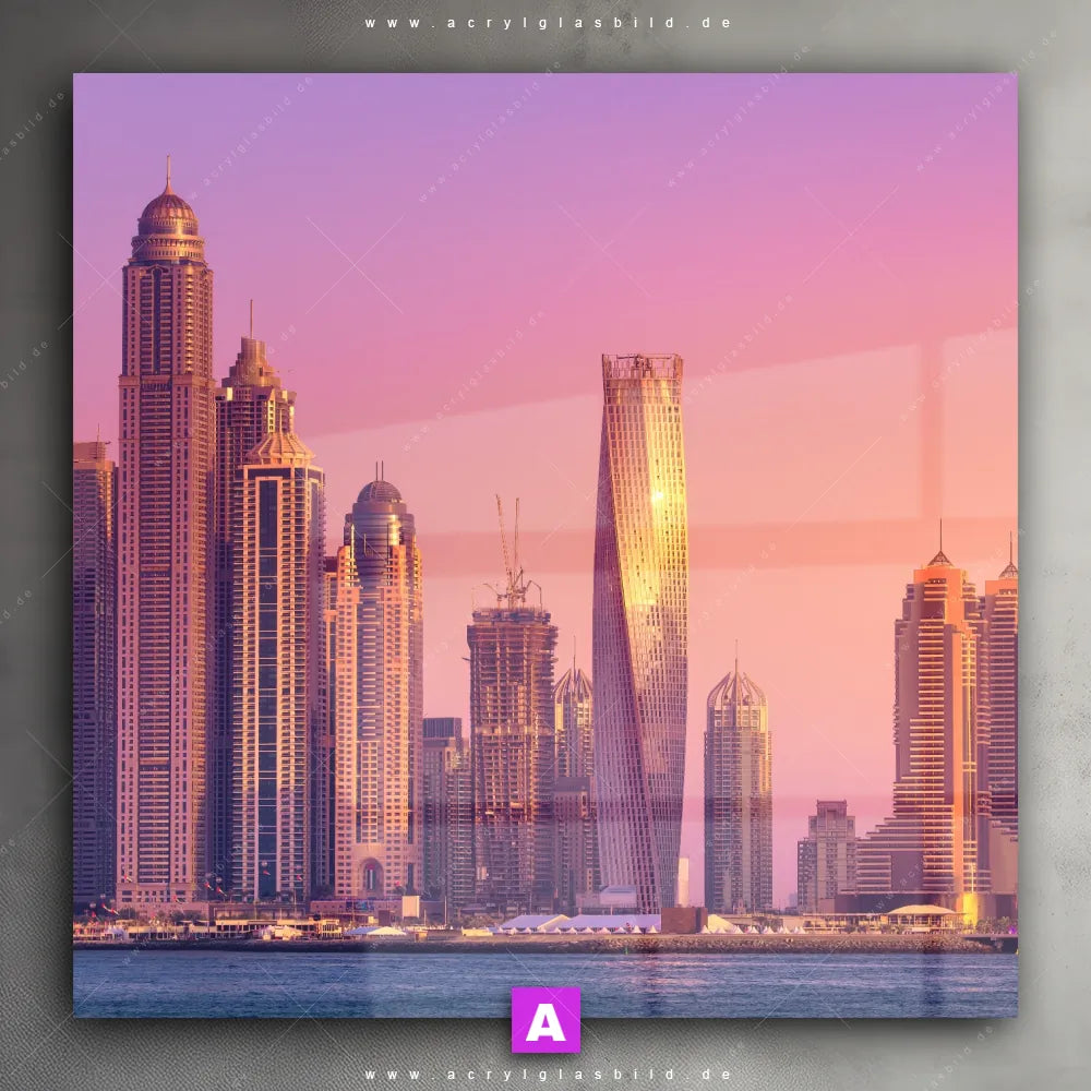 <b>Produktart:</b> Acrylglasbild | Glasbild | Wandbild aus Kunstglas | <b> Motiv:</b> Sonnenaufgang in Dubai | <b> Bildausrichtung:</b> Quadrat | <b> Max. Motiv-Größe:</b> 300cm breit | 200cm hoch | <b> Verfügbare Formate: </b> Quadrat, Querformat, Hochformat, Panorama, Schmal, Rund | <b> Kategorie:</b> Architektur - Gebäude, Städte - Skylines | <b> Farben:</b> Gold, Lila, Pink | <b> Kunstformen:</b> Fotografie | <b> Kunststile:</b> Natürlich - Realistisch, Modern Art