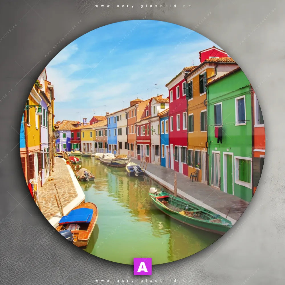 Das Motiv Straßen von Venedig wird im UV-Direktdruck in den Farben Bunt auf die Rückseite einer 5mm starken, transparenten Acrylglasplatte gedruckt. Das durchscheinende Motiv Boote in Venedig im Natürlich - Realistisch Stil wird anschließend vollflächig mit einer weißen Schicht hinterlegt. Das Architektur - Gebäude, Städte - Skylines Acrylglasbild | Rund erhält so eine bemerkenswerte Farbbrillanz, hohe Schärfe und erstaunliche Tiefenwirkung.