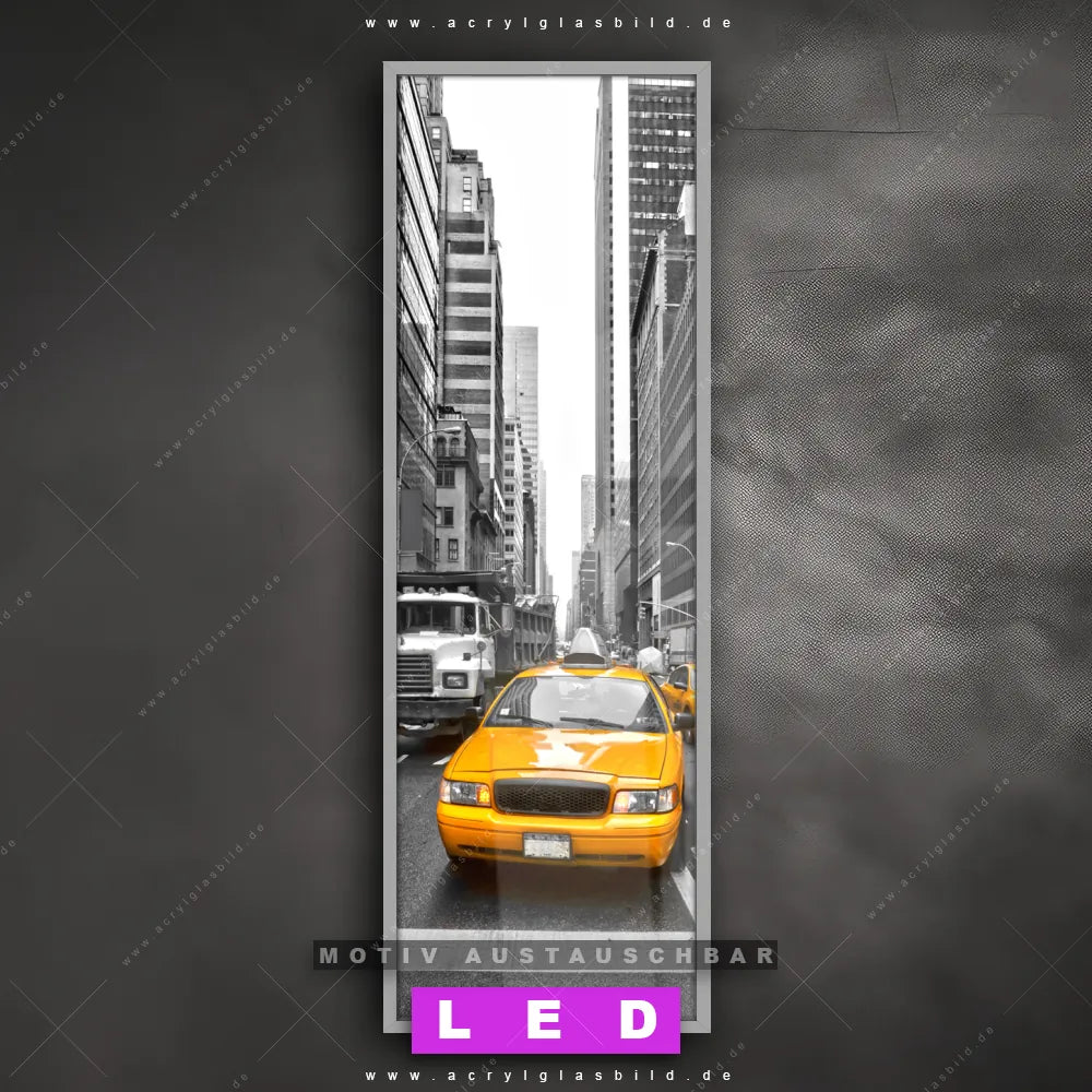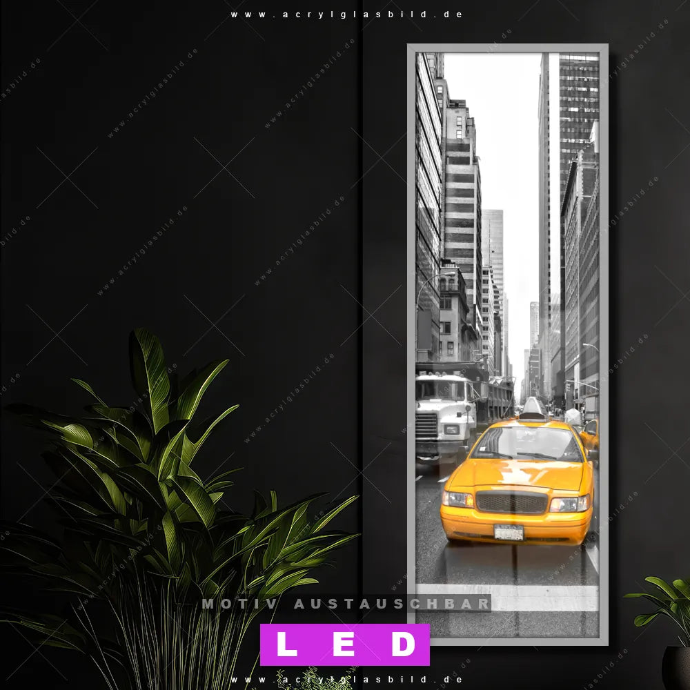 Bist du bereit, deine Wände mit einem dimmbaren LED Bild mit Fernbedienung und optionaler Farbtemperatursteuerung auf das nächste Level zu bringen? Unser Fahrzeuge, Städte - Skylines Canvalight® DIA LED Acrylglasbild ist genau das, was du brauchst! Das Wandbild mit LED Beleuchtung im Schmalen Format mit austauschbarer bedruckter Acrylglas-Scheibe Gelbe Taxis New York bringt Licht und Stil in dein Zuhause – und das in null Komma nichts!