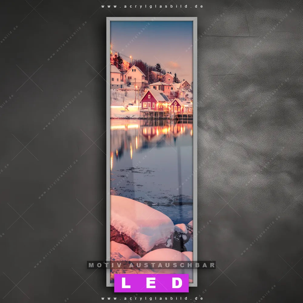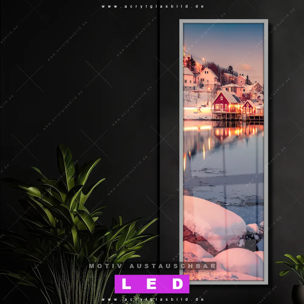 Vergiss dunkle Ecken und langweilige Wände in Wohnzimmer - Schlafzimmer, Büro - Kanzlei, Arzt - Praxis! Mit unserem LED Acrylglasbild Canvalight® DIA Rotlichtlaternen in Küstenstadt wirst du nie wieder im Dunkeln tappen. Suchst du nach einem beleuchteten Wandbild mit Winter, Norwegen, Skandinavien, See, Berg, Haus, Dorf, Sonnenuntergang, Natur? Dann ist unser Leuchtbild Abenddämmerung auf Lofoten-Insel mit den strahlenden Motiv-Farben Blau, Rot, Weiss genau das richtige LED Bild für dich. Egal, ob dein Stil minimalistisch oder exotisch ist, dieses LED Leuchtbild im Natürlich - Realistisch Stil mit DIA-Klapprahmen und glänzender Front aus Acrylglas passt perfekt zu jeder Einrichtung.