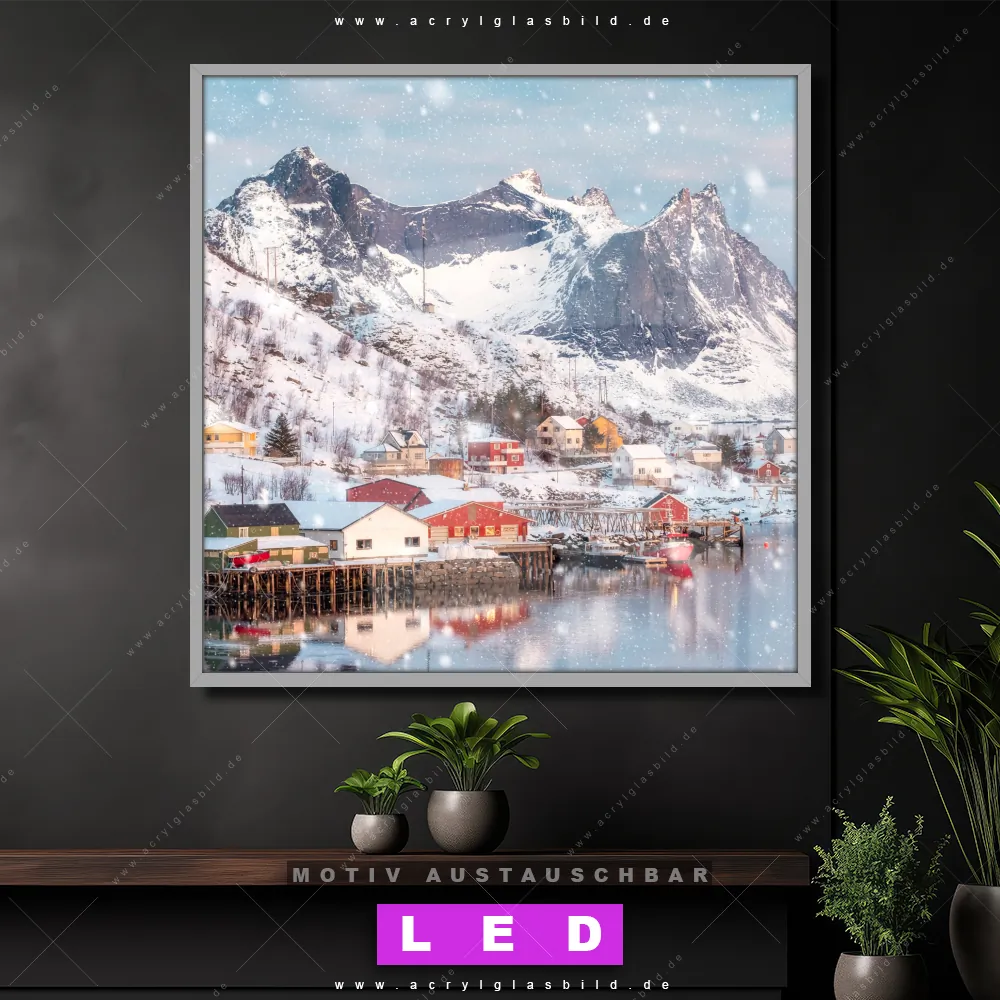 Also, worauf wartest du noch? Gib mit einem beleuchteten Wandbild mit wechselbarer Acrylglas-Scheibe deinen Wänden das gewisse Etwas und bestelle jetzt das LED Acrylglasbild Canvalight® DIA Norwegisches Fischerdorf an der Küste – dein Zuhause wird es dir danken und deine Freunde werden dank der wechselbaren Motive erblassen!