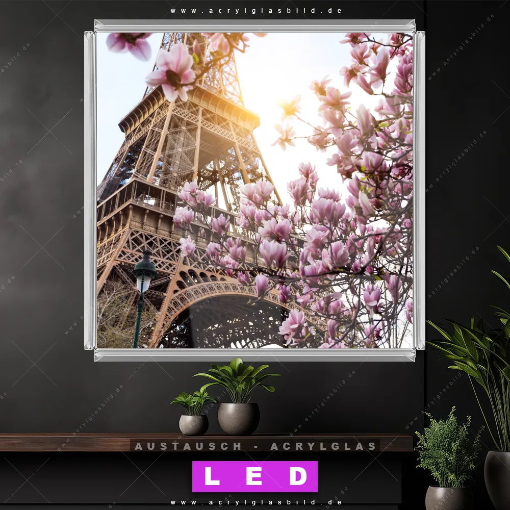 Begriffe wie Blumen | Botanik, Pflanze, Natur, Blüte, Nahaufnahme, Mangnolie, Paris, Frankreich, Eifelturm, romantisch, Reisen haben dich auf der Suche nach deinem neuen Austausch-Acrylglasbild inspiriert? Dann sollte das Wechsel-Acrylglasbild Romantik am Eiffelturm für dein bereits vorhandenes LED Acrylglasbild Canvalight® DIA den Weg zu dir finden.