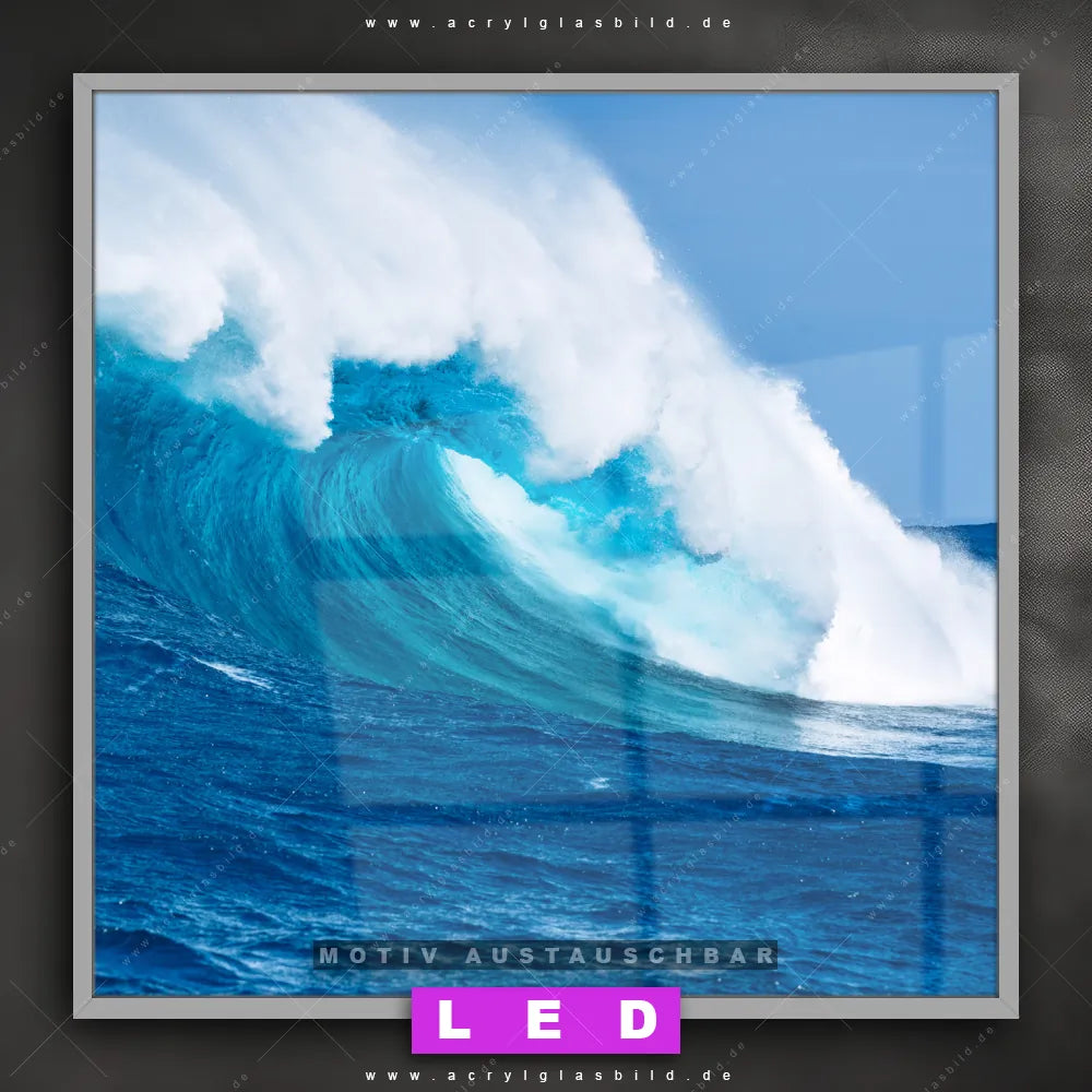 Bist du bereit, deine Wände mit einem dimmbaren LED Bild mit Fernbedienung und optionaler Farbtemperatursteuerung zum Leuchten zu bringen? Wir haben das ultimative Strand - Meer LED Acrylglasbild Canvalight® DIA für dich! Unser LED Wandbild aus Acrylglas Blaue Welle im Meer im Quadratischen Format mit austauschbarer bedruckter Acrylglas-Scheibe im DIA-Klapprahmen bringt sofort jede Menge Glanz in deine vier Wände.