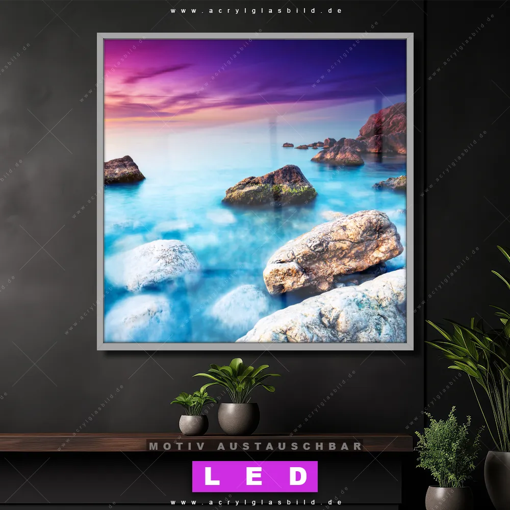 Bist du bereit, deine Wände mit einem dimmbaren LED Bild mit Fernbedienung und optionaler Farbtemperatursteuerung zum Leuchten zu bringen? Wir haben das ultimative Landschaften, Strand - Meer LED Acrylglasbild Canvalight® DIA für dich! Unser LED Wandbild aus Acrylglas Felsen im Meer im Quadratischen Format mit austauschbarer bedruckter Acrylglas-Scheibe im DIA-Klapprahmen bringt sofort jede Menge Glanz in deine vier Wände.