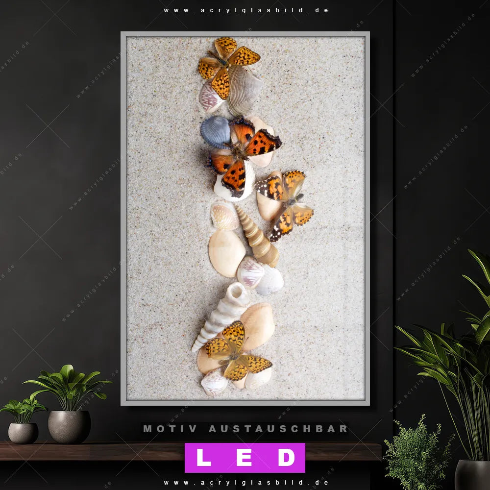 LED Acrylglasbild Canvalight® DIA | Schmetterlinge & Muscheln im Sand | Hochformat