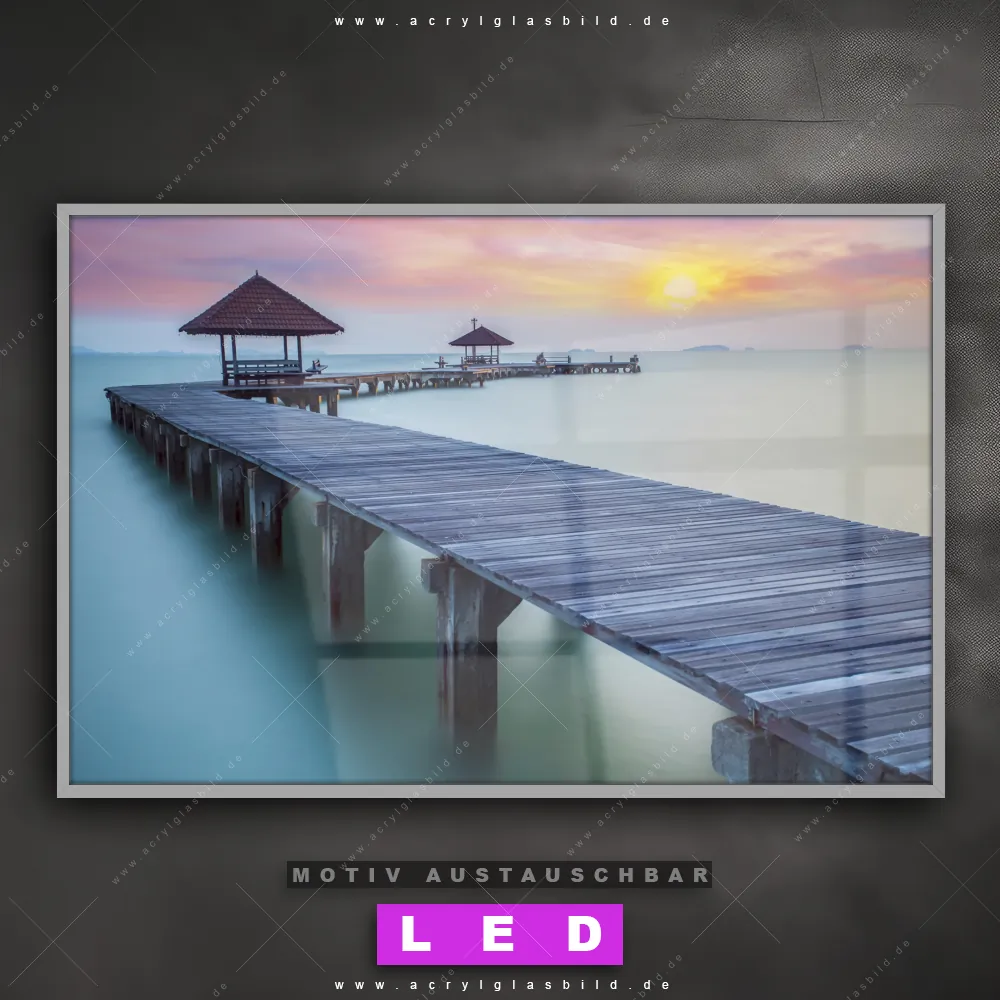 Du bist auf der Suche nach einem dimmbaren Strand - Meer, Landschaften LED Bild mit Fernbedienung und optionaler Farbtemperatursteuerung? Dann haben wir hier genau das richtige Wandbild mit LED Beleuchtung für dich: Unser Canvalight® DIA LED Acrylglasbild Steg ins Meer im Querformat mit austauschbarer bedruckter Acrylglas-Scheibe. Dieses Leuchtbild bringt sofort Partybeleuchtung in deine Räume!