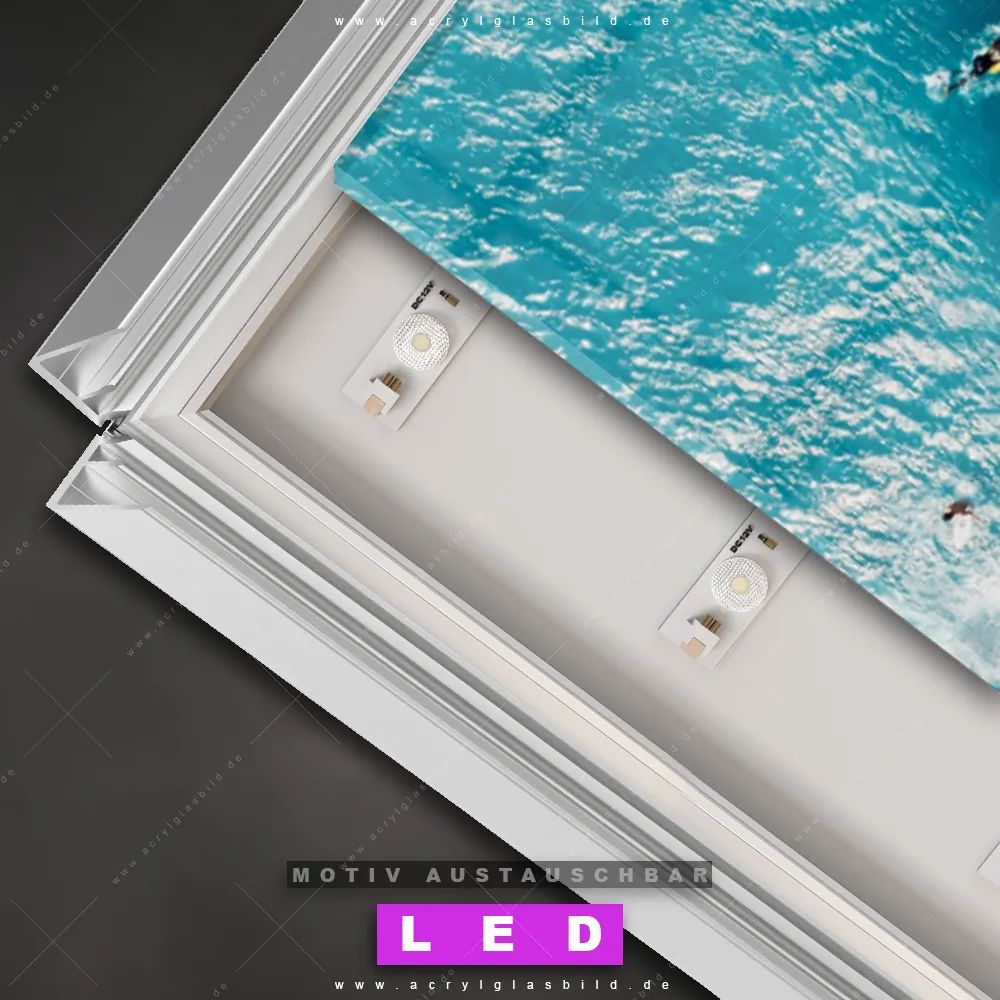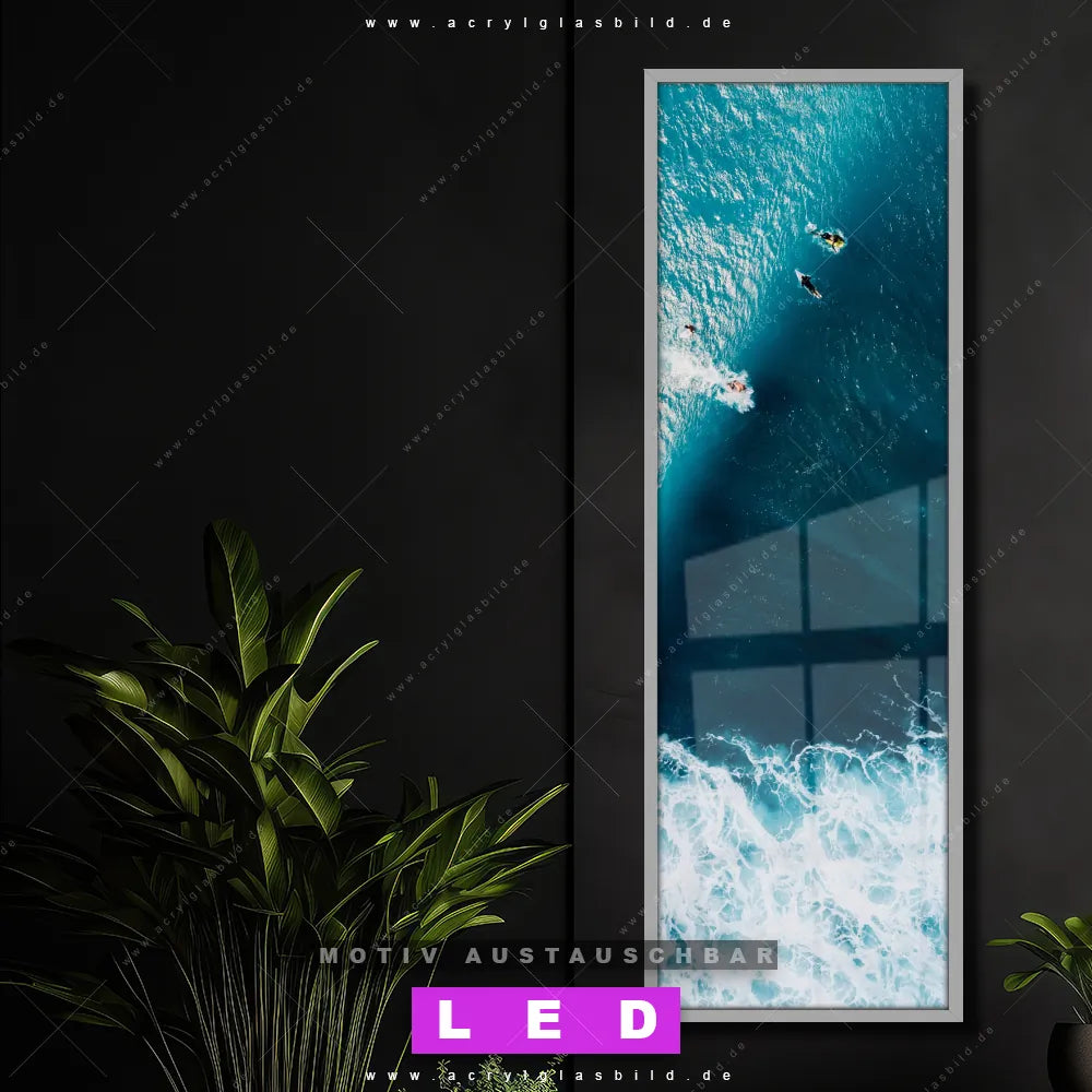 Bist du bereit, deine Wände mit einem dimmbaren LED Bild mit Fernbedienung und optionaler Farbtemperatursteuerung auf das nächste Level zu bringen? Unser Strand - Meer Canvalight® DIA LED Acrylglasbild ist genau das, was du brauchst! Das Wandbild mit LED Beleuchtung im Schmalen Format mit austauschbarer bedruckter Acrylglas-Scheibe Surfer Welle bringt Licht und Stil in dein Zuhause – und das in null Komma nichts!