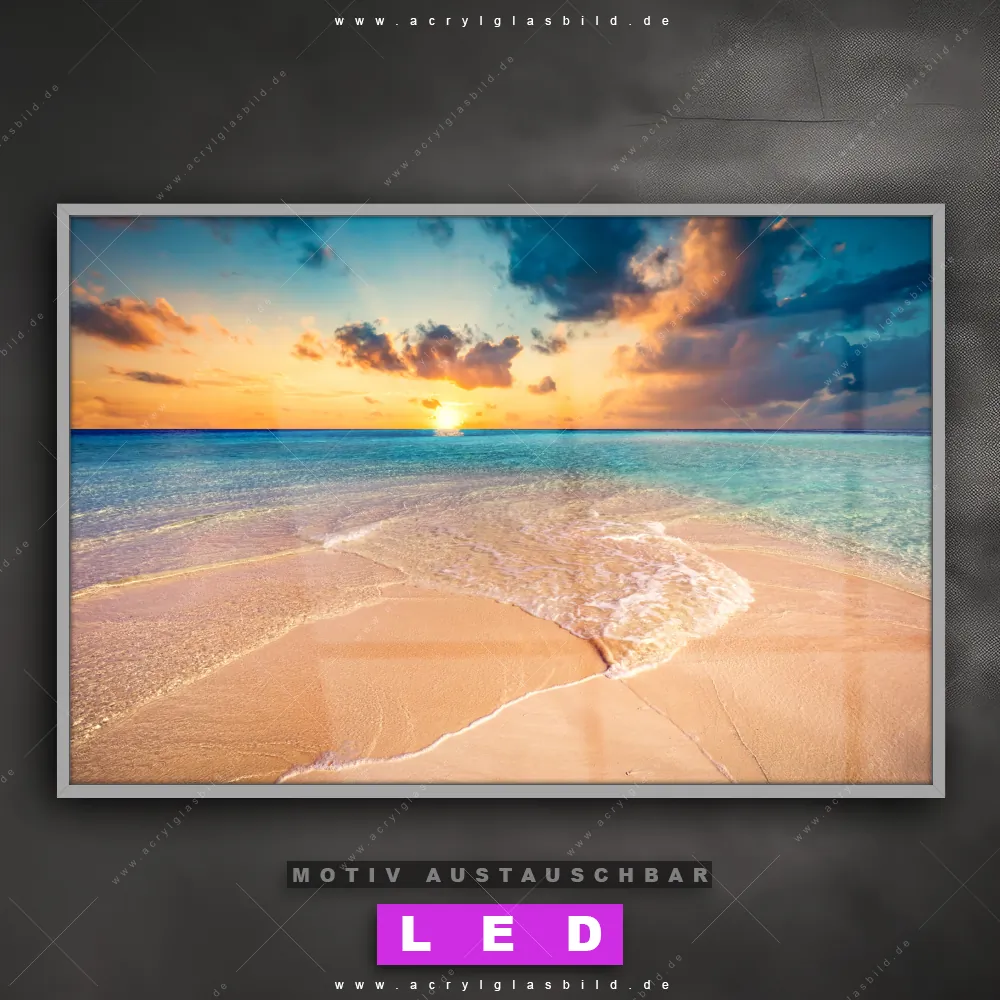 Begriffe wie Ozean, Wasser, Küste, Horizont, Sand, Sonne, Nordsee, Ostsee, Mittelmeer, Insel, Malediven, Südsee - Karibik, Urlaub - Reisen, Sonnenuntergang - Sonnenaufgang haben dich auf der Suche nach deinem neuen LED Wandbild aus Acrylglas inspiriert? Dann sollte das LED Acrylglasbild Meer im Sonnenuntergang den Weg zu dir finden.