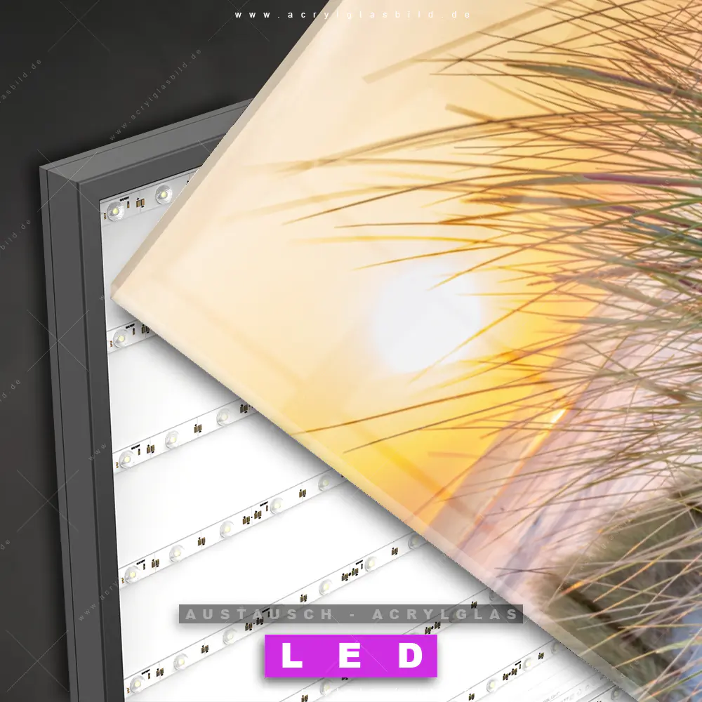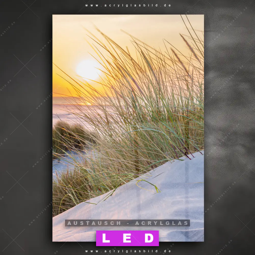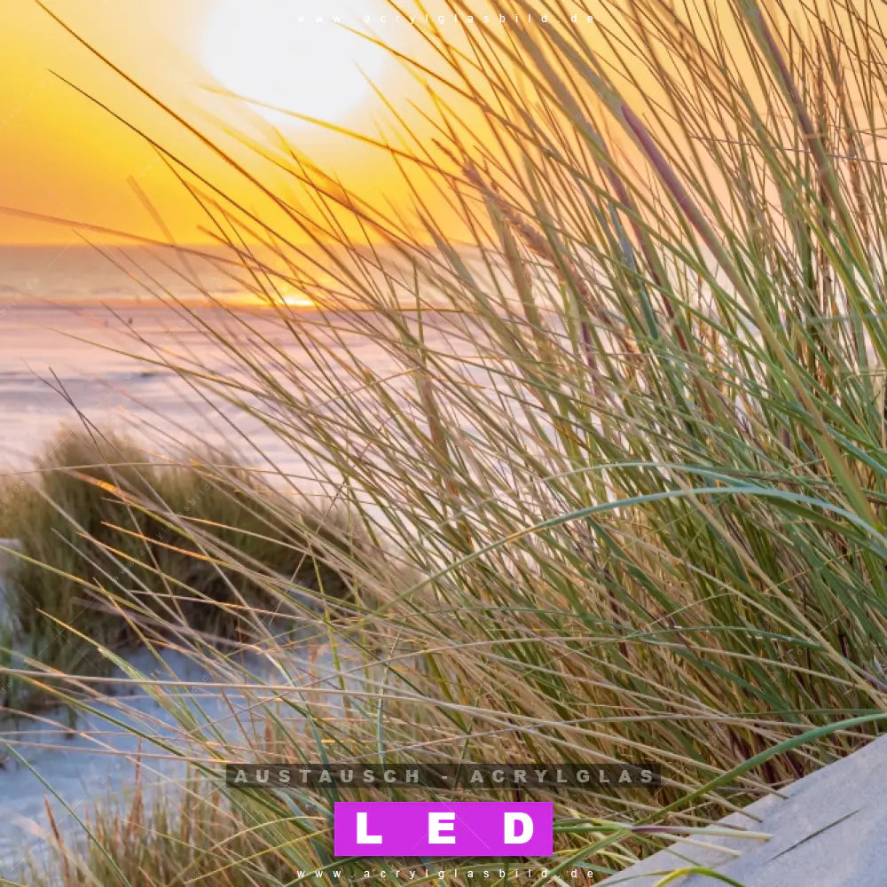 Begriffe wie Deutschland, Frühling, Sommer, Dünen, Gräser, Nordsee, Ostsee, Sonnenuntergang, Urlaub, Meer, Strand haben dich auf der Suche nach deinem neuen Austausch-Acrylglasbild inspiriert? Dann sollte das Wechsel-Acrylglasbild Sonnenuntergang über den Dünen für dein bereits vorhandenes LED Acrylglasbild Canvalight® DIA den Weg zu dir finden.