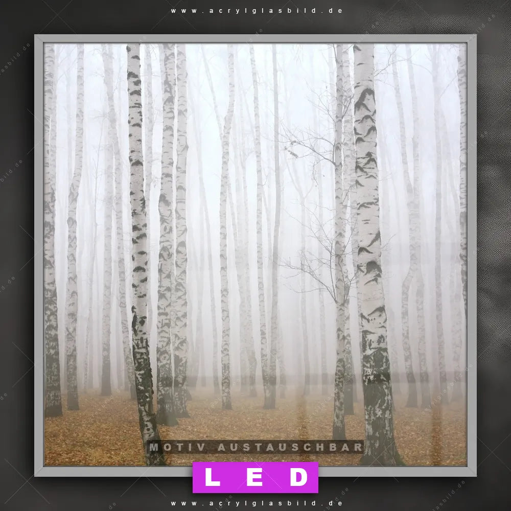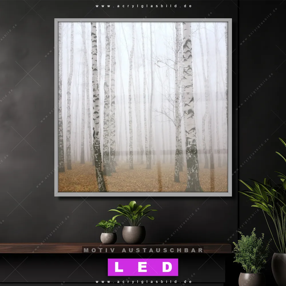 Bist du bereit, deine Wände mit einem dimmbaren LED Bild mit Fernbedienung und optionaler Farbtemperatursteuerung zum Leuchten zu bringen? Wir haben das ultimative Landschaften, Wald - Bäume LED Acrylglasbild Canvalight® DIA für dich! Unser LED Wandbild aus Acrylglas Nebel im Birkenwald im Quadratischen Format mit austauschbarer bedruckter Acrylglas-Scheibe im DIA-Klapprahmen bringt sofort jede Menge Glanz in deine vier Wände.