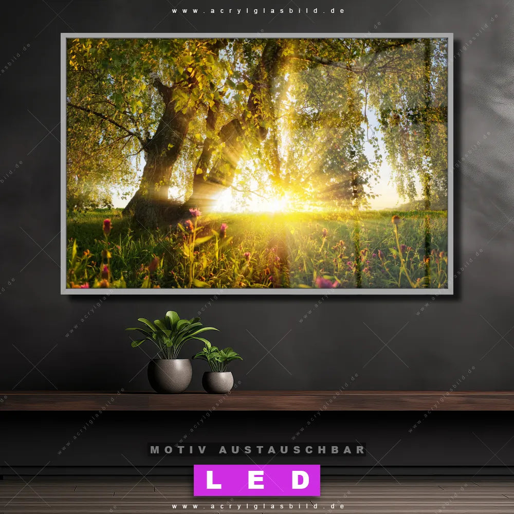 Mit unserem LED Acrylglasbild Canvalight® DIA Waldidylle und seiner genialen LED-Ausleuchtung wirst du nie wieder im Dunkeln auf deinem Sofa herumtappen. Wenn du nach einem beleuchteten Wandbild aus Acrylglas mit Bäume, Natur, Lichtung, Idylle, Waldspaziergang für Arzt - Praxis, Büro - Kanzlei, Wohnzimmer - Schlafzimmer suchst, ist unser LED Leuchtbild Sonnenaufgang am Wiesenrand in den beeindruckenden Motiv-Farben Grün, Braun, Lila genau das richtige beleuchtete Wandbild für dich. Gestaltet im Natürlich - Realistisch Stil, passt dieses LED Wandbild mit DIA-Klapprahmen und glänzender Front aus Acrylglas perfekt zu jedem Einrichtungsstil – sogar zu deinem chaotischen kreativen Durcheinander!