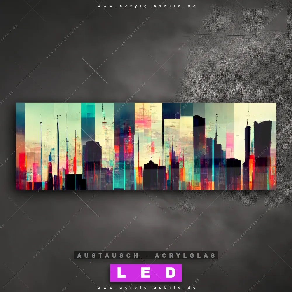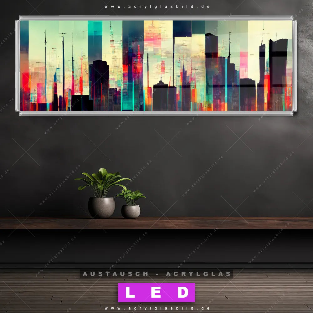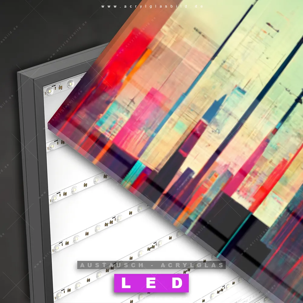 Begriffe wie Skyline, Metropole, Häuser, Wolkenkratzer, Hochhäuser, Stadt, Gebäude, Kunst, Malerei haben dich auf der Suche nach deinem neuen Austausch-Acrylglasbild inspiriert? Dann sollte das Wechsel-Acrylglasbild Bunte Skyline-Malerei für dein bereits vorhandenes LED Acrylglasbild Canvalight® DIA den Weg zu dir finden.