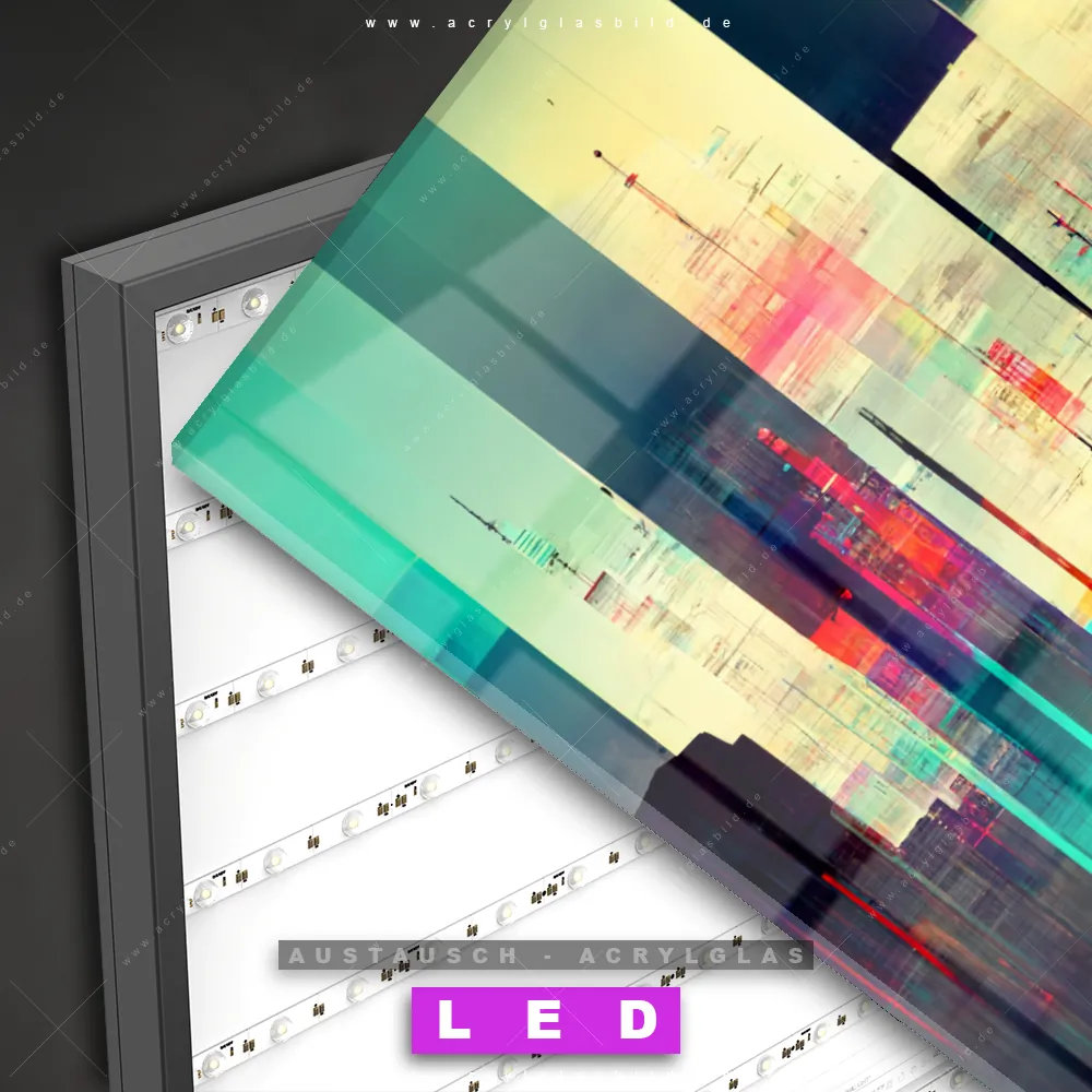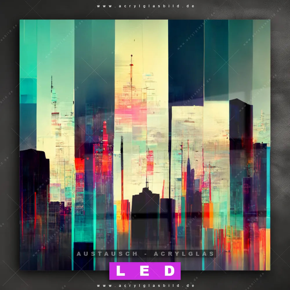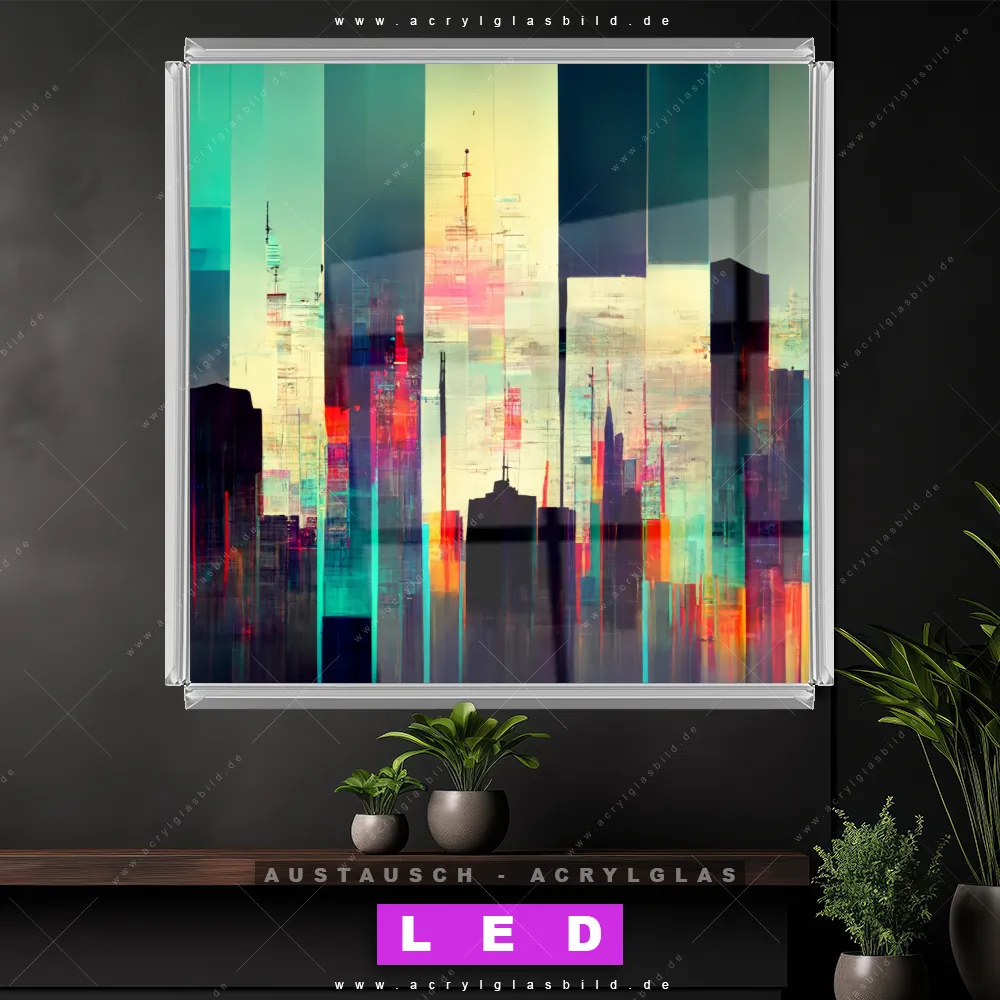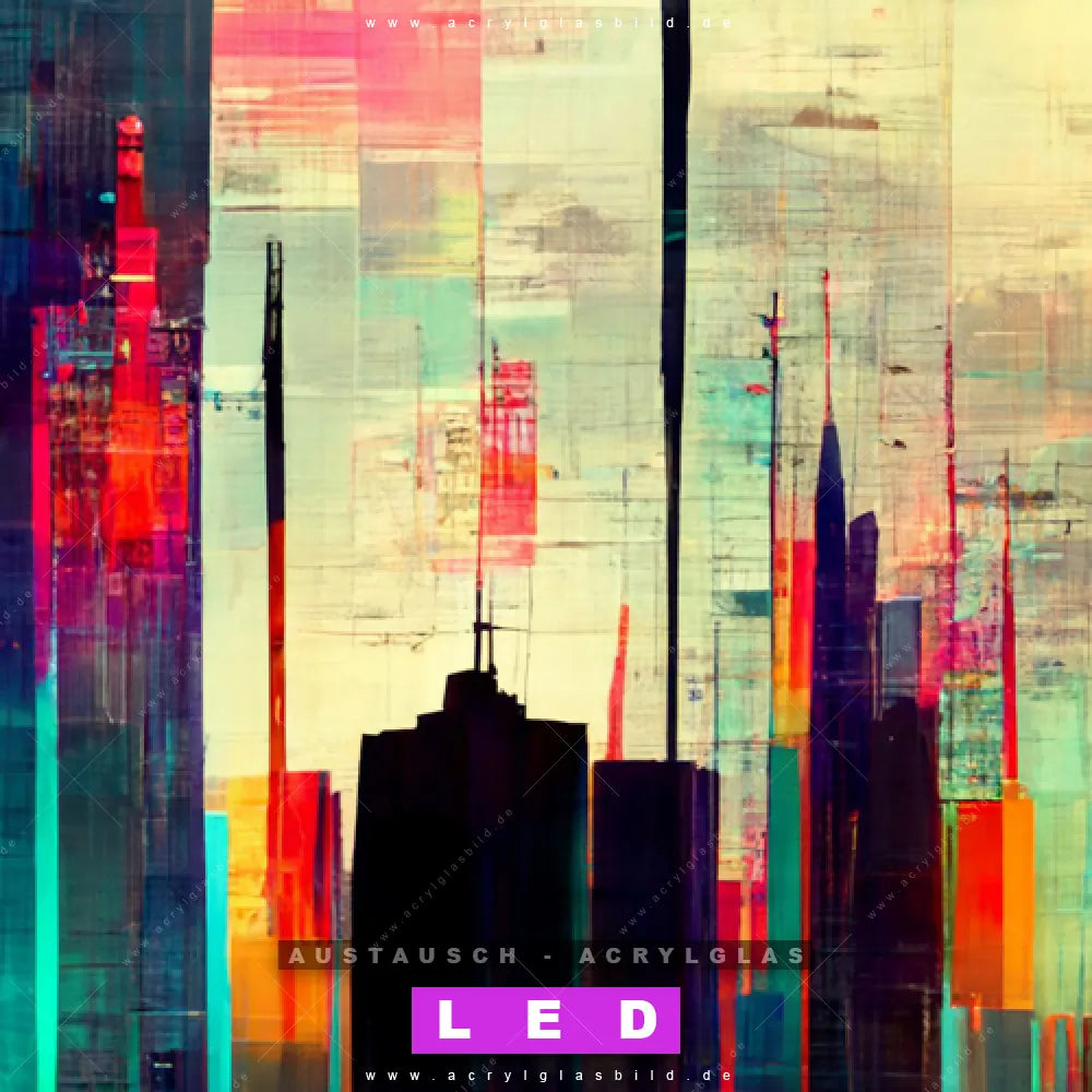 Begriffe wie Skyline, Metropole, Häuser, Wolkenkratzer, Hochhäuser, Stadt, Gebäude, Kunst, Malerei haben dich auf der Suche nach deinem neuen Austausch-Acrylglasbild inspiriert? Dann sollte das Wechsel-Acrylglasbild Bunte Skyline-Malerei für dein bereits vorhandenes LED Acrylglasbild Canvalight® DIA den Weg zu dir finden.