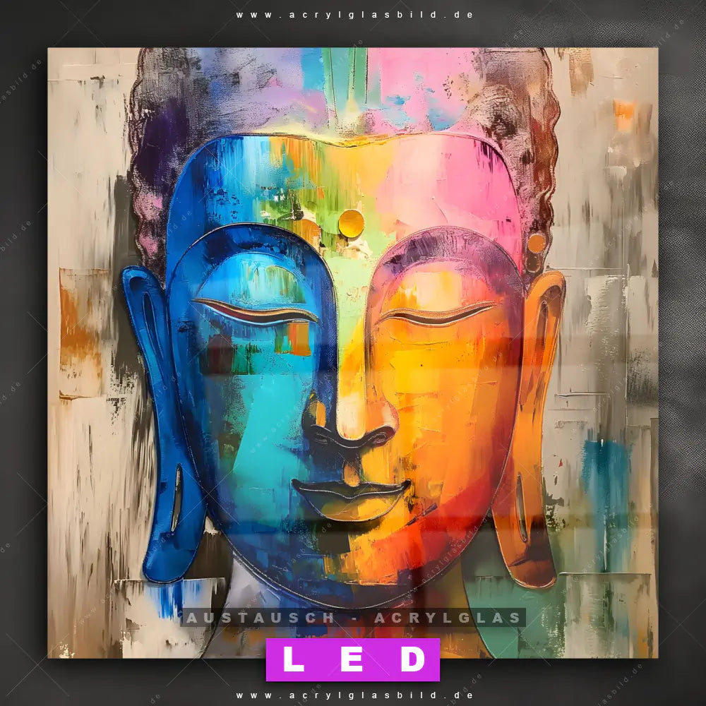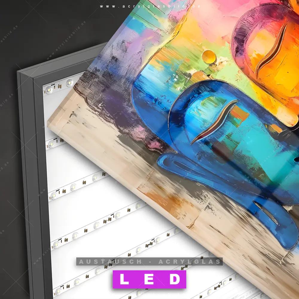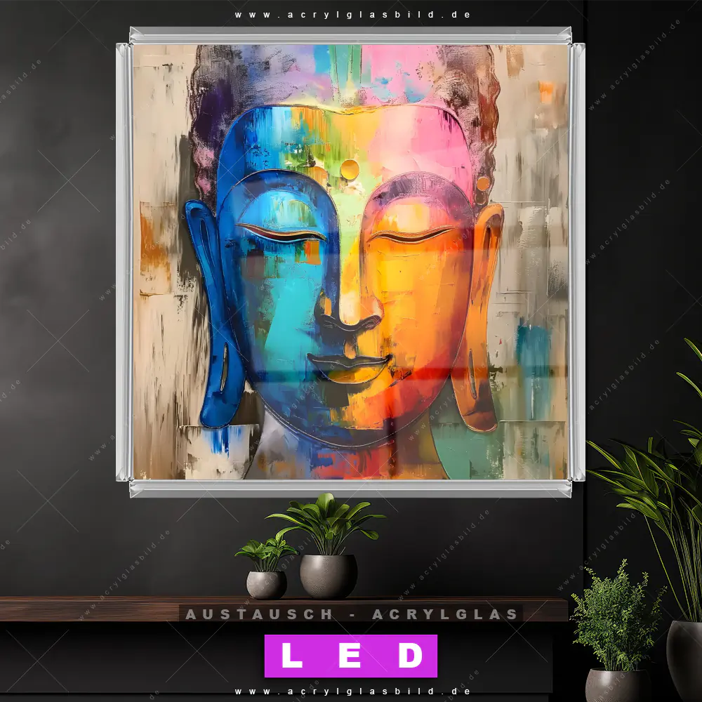 Begriffe wie Buddha, Buddhismus, Religion, Feng Shui, Zen, Meditation, Gemälde, Gesicht, Kopf, Porträt haben dich auf der Suche nach deinem neuen Austausch-Acrylglasbild inspiriert? Dann sollte das Wechsel-Acrylglasbild Spirituelles Buddha-Porträt für dein bereits vorhandenes LED Acrylglasbild Canvalight® DIA den Weg zu dir finden.