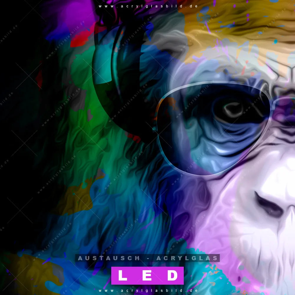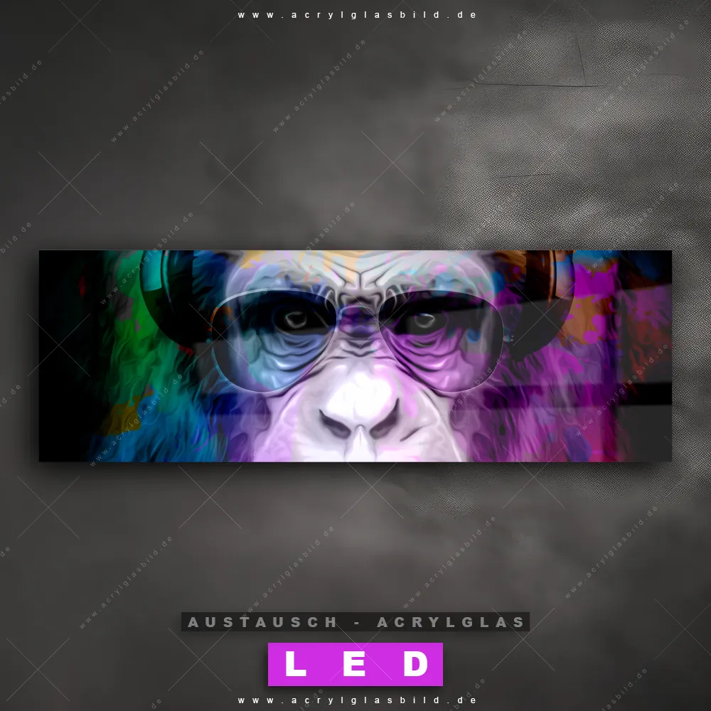 Begriffe wie Tier, Affe, Monkey, Brille, Sonnenbrille, cool, Chimpanzee, Schimpanse, Kopfhörer, Musik haben dich auf der Suche nach deinem neuen Austausch-Acrylglasbild inspiriert? Dann sollte das Wechsel-Acrylglasbild Affe hört Musik für dein bereits vorhandenes LED Acrylglasbild Canvalight® DIA den Weg zu dir finden.