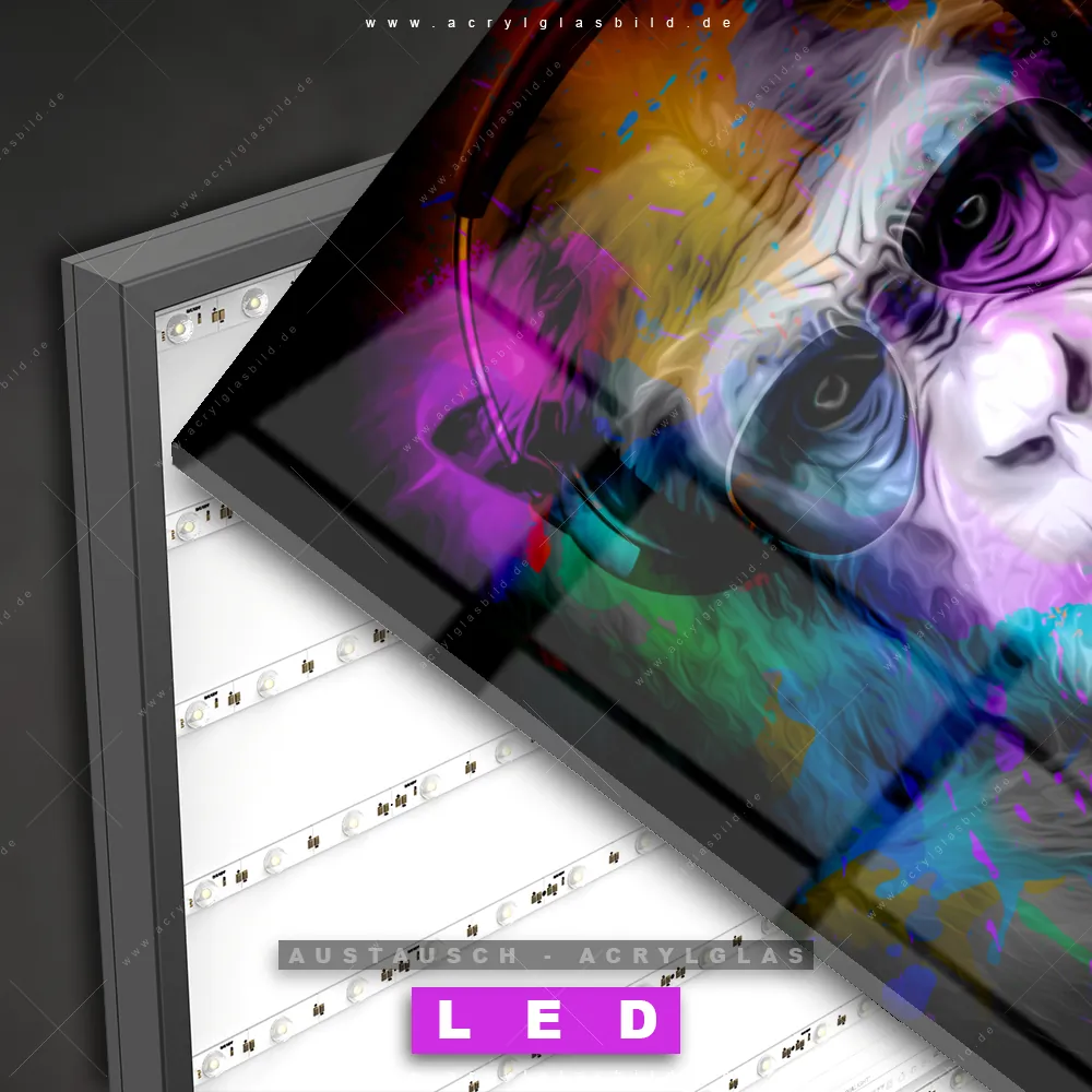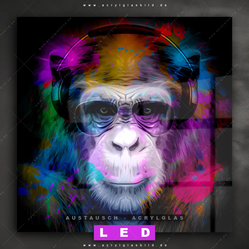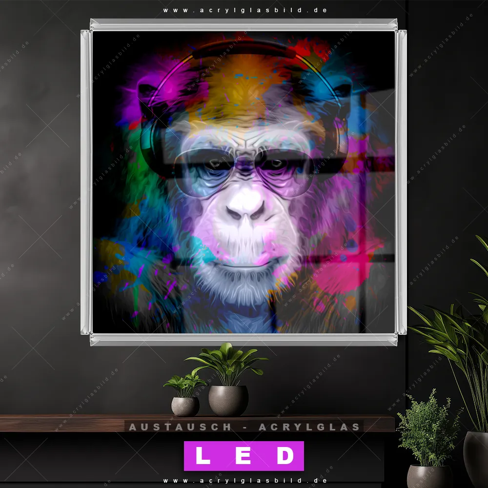 Begriffe wie Tier, Affe, Monkey, Brille, Sonnenbrille, cool, Chimpanzee, Schimpanse, Kopfhörer, Musik haben dich auf der Suche nach deinem neuen Austausch-Acrylglasbild inspiriert? Dann sollte das Wechsel-Acrylglasbild Affe hört Musik für dein bereits vorhandenes LED Acrylglasbild Canvalight® DIA den Weg zu dir finden.
