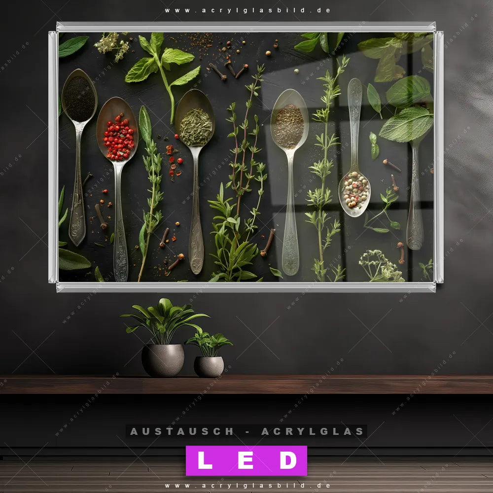 Begriffe wie Löffel, Besteck, Kräuter, Gewürze, kochen, Zutaten, Lebensmittel, Geschmack, Aromen haben dich auf der Suche nach deinem neuen Austausch-Acrylglasbild inspiriert? Dann sollte das Wechsel-Acrylglasbild Löffel mit Gewürzen für dein bereits vorhandenes LED Acrylglasbild Canvalight® DIA den Weg zu dir finden.