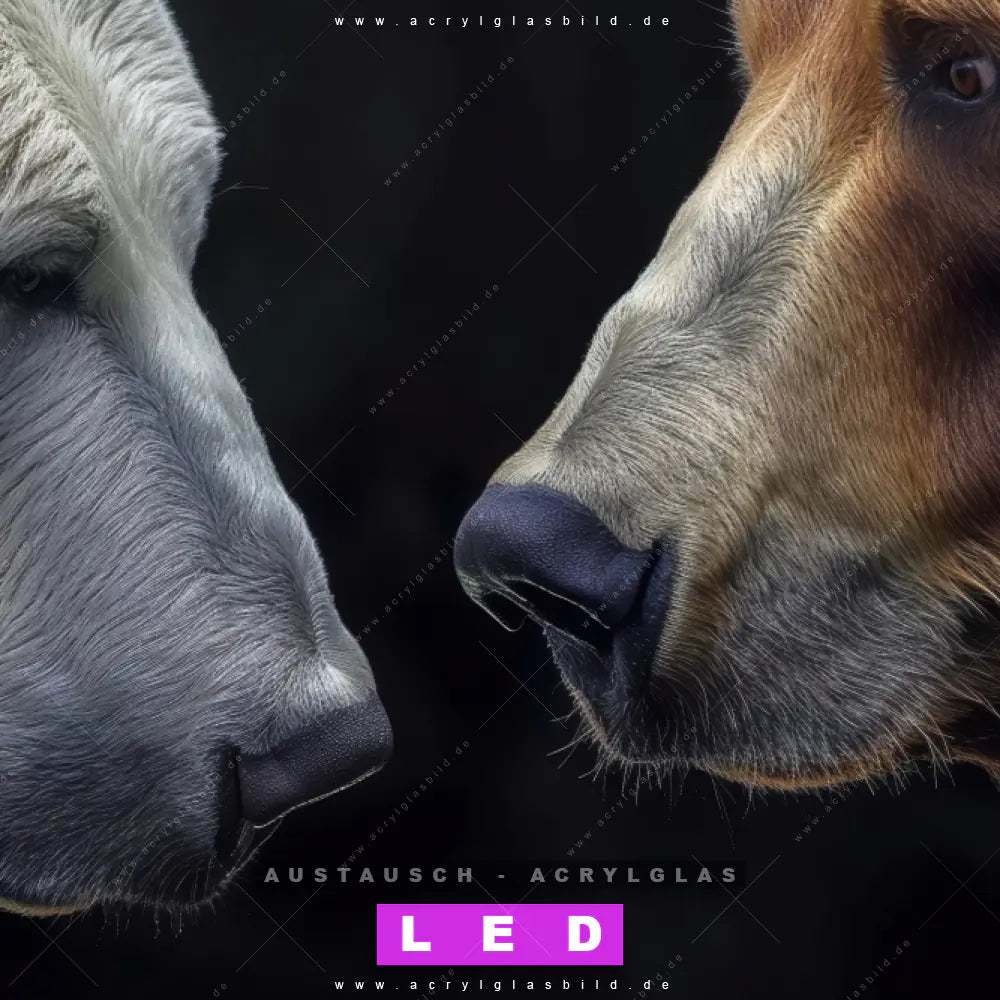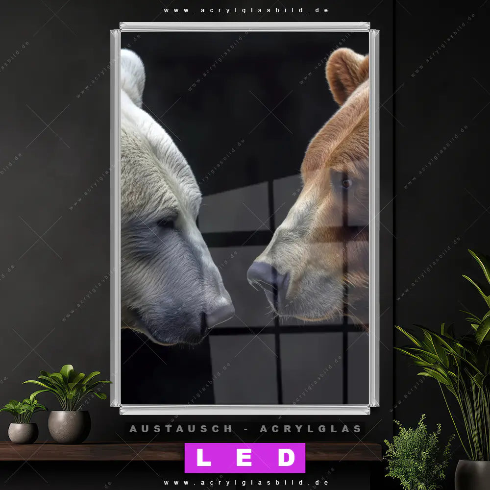 Begriffe wie Bär, Natur, Grizzly, Braunbär, Eisbär, Polarbär, Rivalität, Harmonie, Stärke haben dich auf der Suche nach deinem neuen Austausch-Acrylglasbild inspiriert? Dann sollte das Wechsel-Acrylglasbild Eisbär und Braunbär für dein bereits vorhandenes LED Acrylglasbild Canvalight® DIA den Weg zu dir finden.