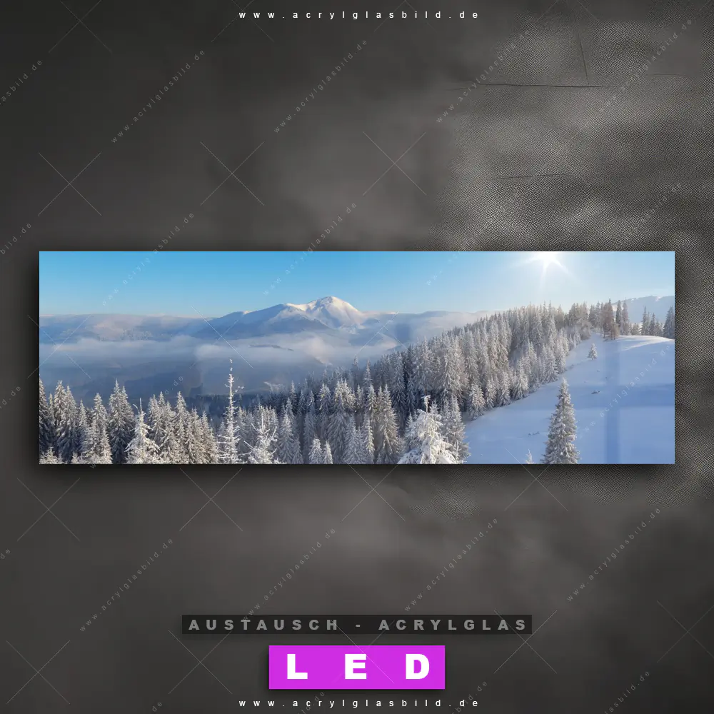 Begriffe wie Berge, Gebirge, Schneelandschaft, Winter, Schnee, Weihnachten, Nadelwald, Tannenbäume, Sonnenlicht, Sonne, Sonnenaufgang haben dich auf der Suche nach deinem neuen Austausch-Acrylglasbild inspiriert? Dann sollte das Wechsel-Acrylglasbild Schnee, Bäume und Sonne in den Bergen für dein bereits vorhandenes LED Acrylglasbild Canvalight® DIA den Weg zu dir finden.