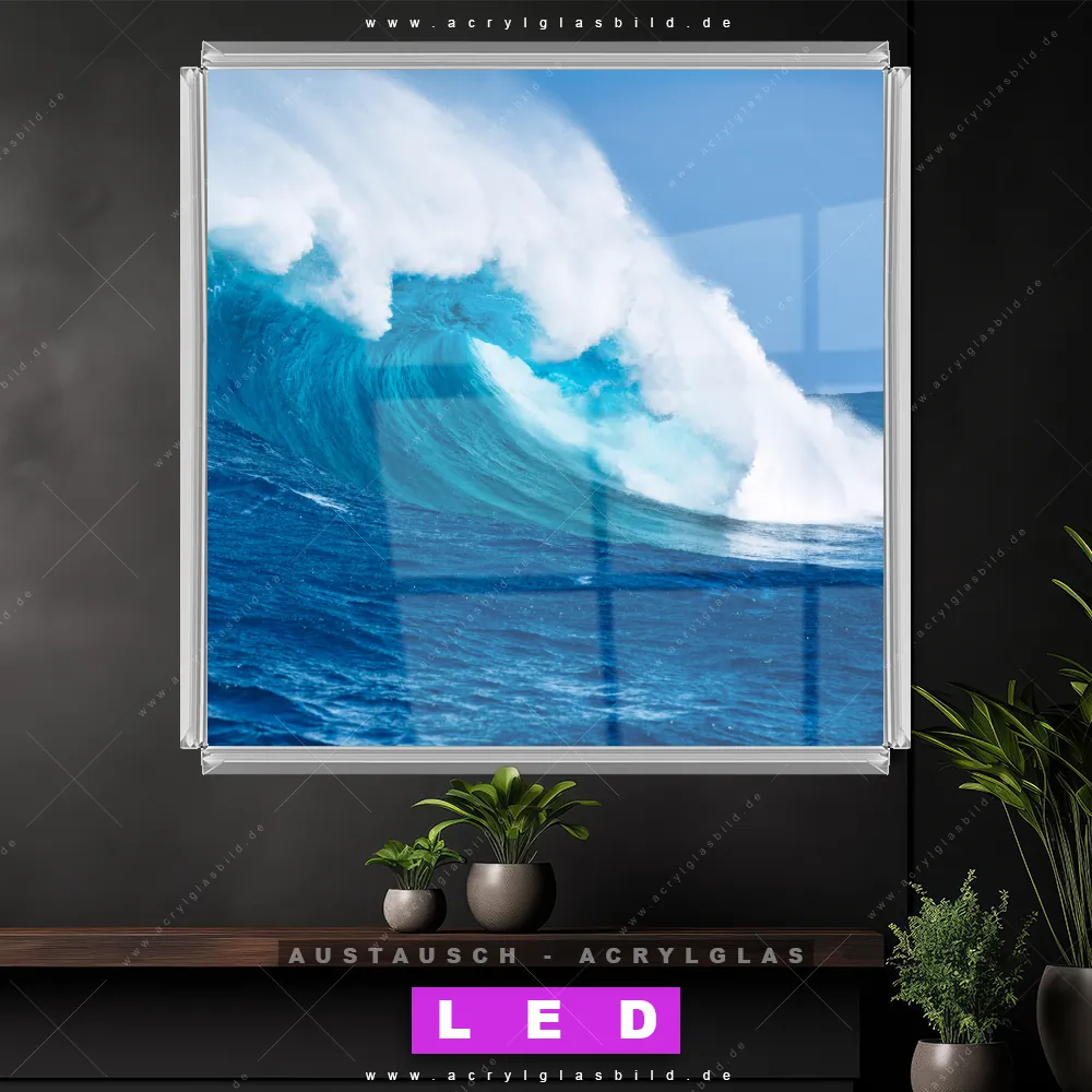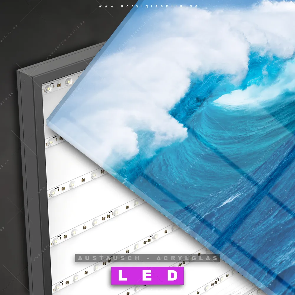 Begriffe wie Ozean, Wasser, Kraft, Sommer, Südsee - Karibik, Urlaub - Reisen, Wellen -Surfen haben dich auf der Suche nach deinem neuen Austausch-Acrylglasbild inspiriert? Dann sollte das Wechsel-Acrylglasbild Blaue Meereswelle für dein bereits vorhandenes LED Acrylglasbild Canvalight® DIA den Weg zu dir finden.