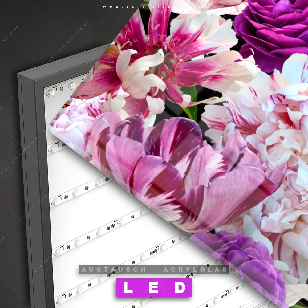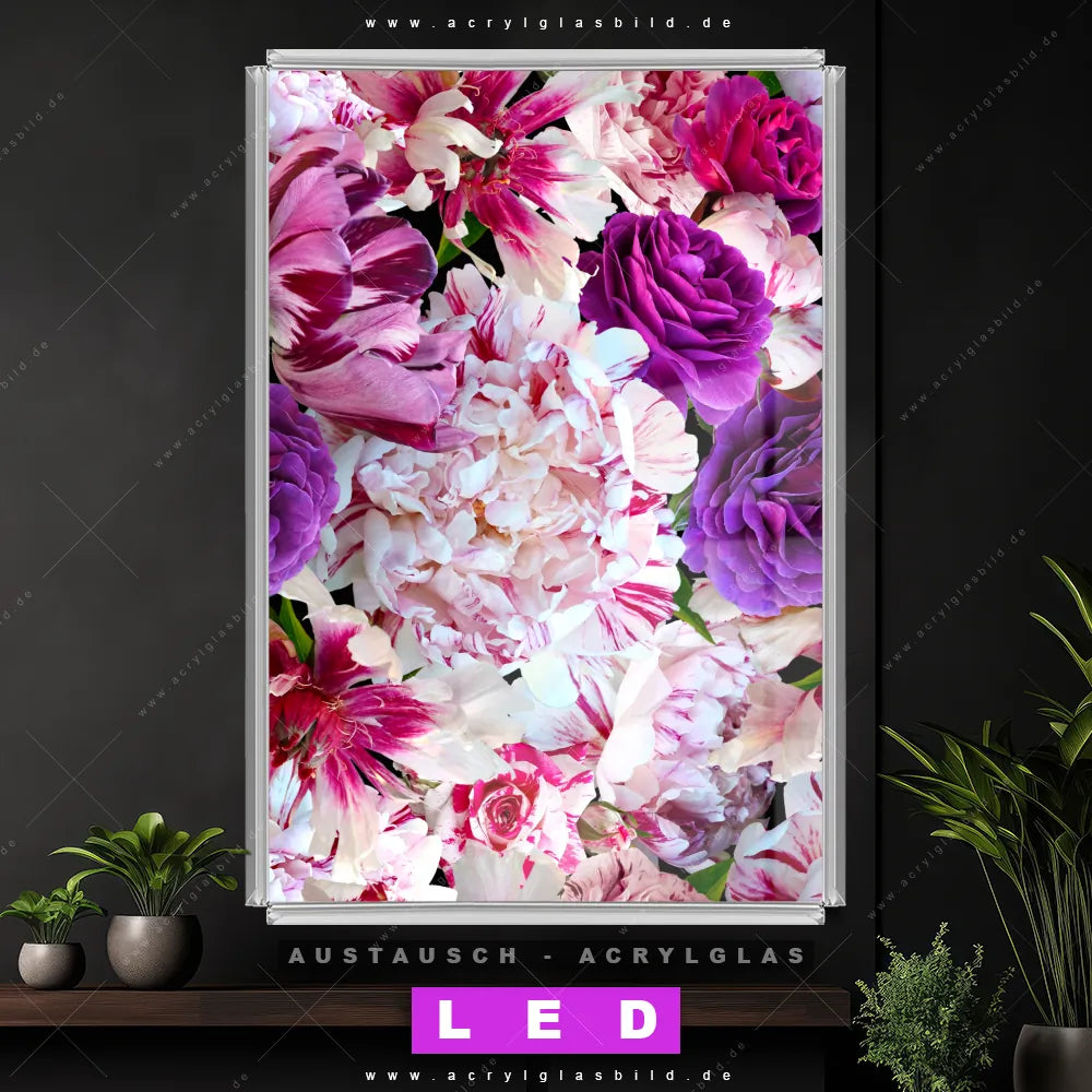 Begriffe wie Pflanze, Natur, Blüte, Nahaufnahme, Draufsicht, vintage, Blumen, Rosen, Blüten, Pfingstrosen, Blumenstrauß haben dich auf der Suche nach deinem neuen Austausch-Acrylglasbild inspiriert? Dann sollte das Wechsel-Acrylglasbild Blüten in rosa, lila, pink und weiß für dein bereits vorhandenes LED Acrylglasbild Canvalight® DIA den Weg zu dir finden.