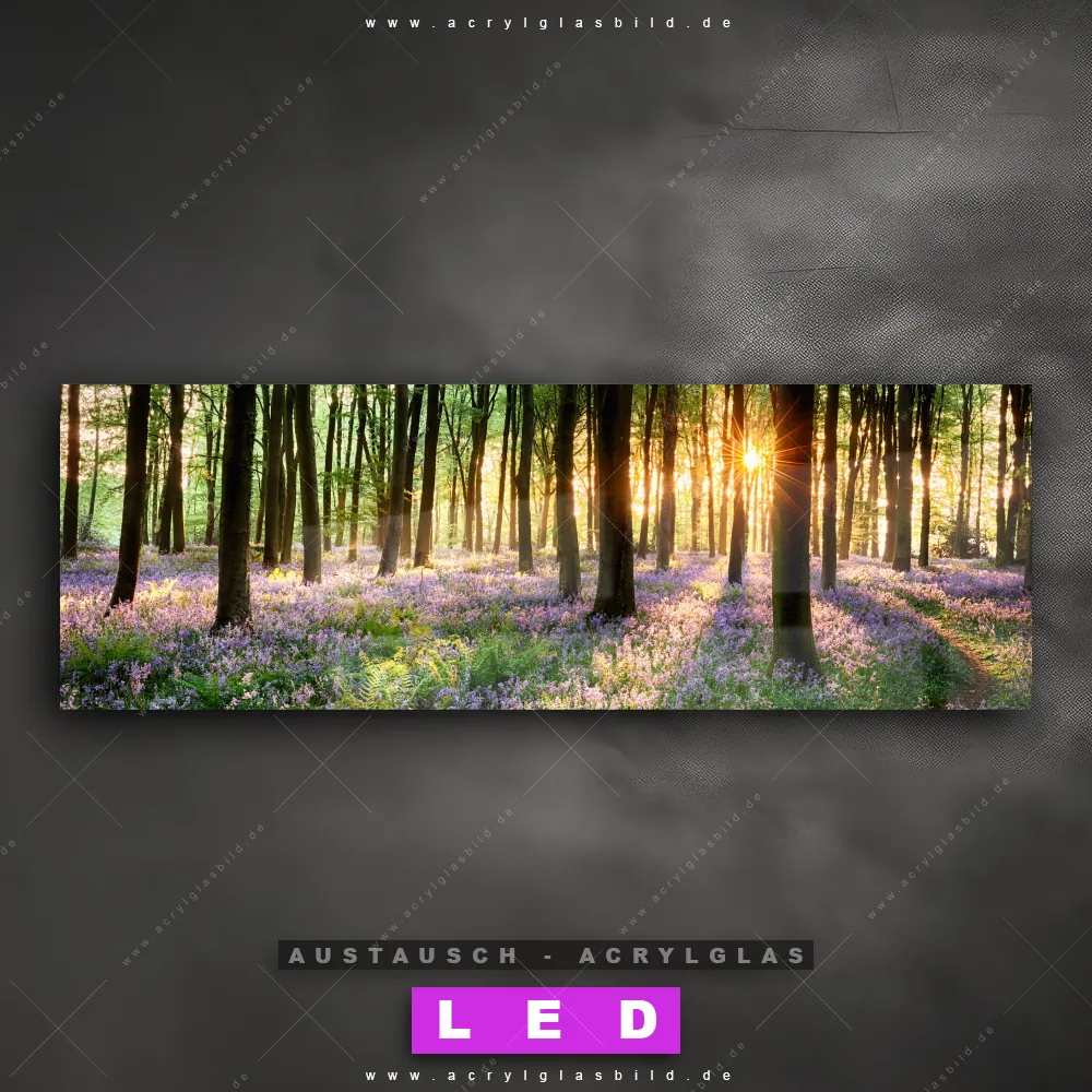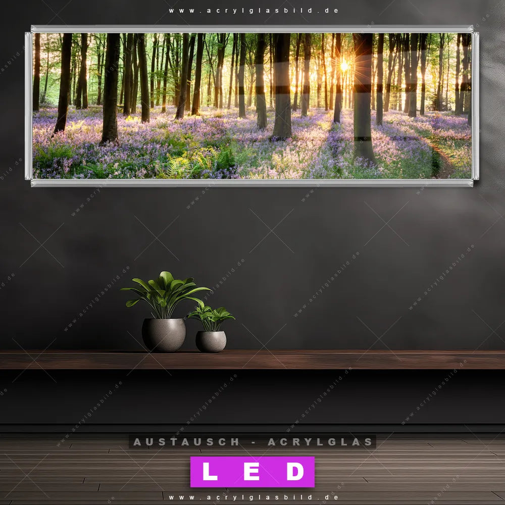 Wechsel-Acrylglas Canvalight® DIA | Blühender Wald bei Sonnenaufgang | Panorama