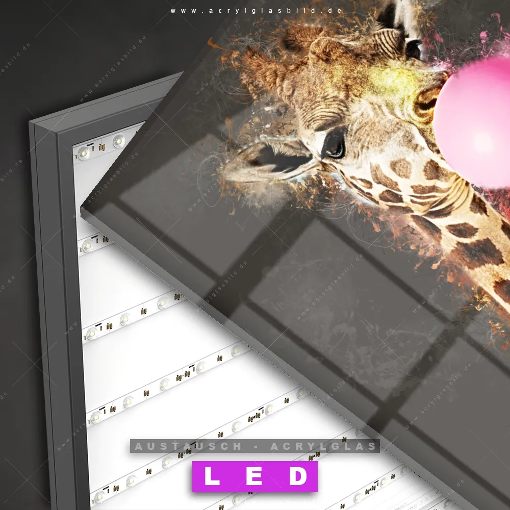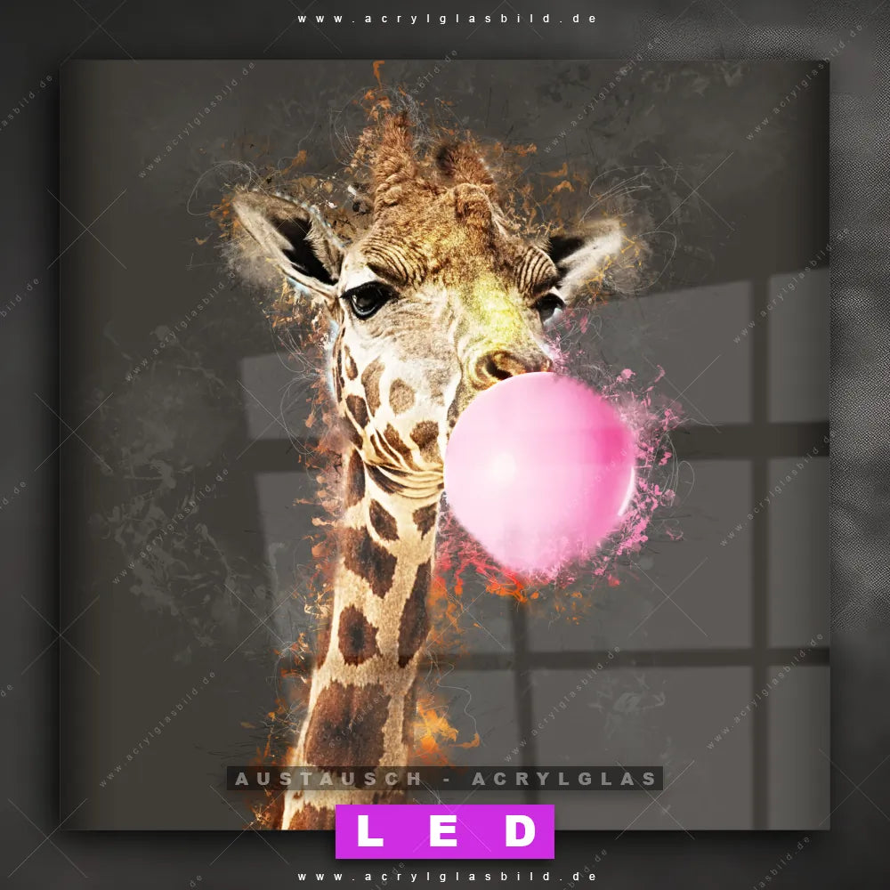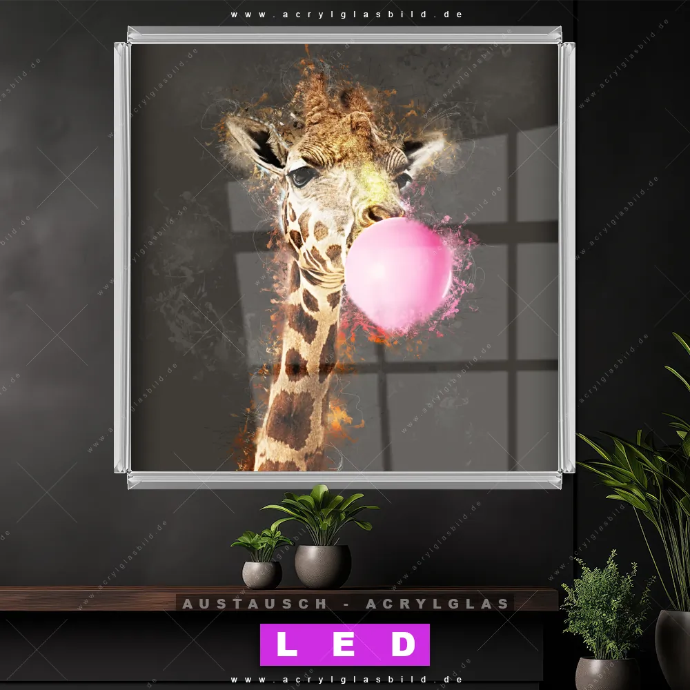 Begriffe wie Tier, Giraffe, Kaugummi, Bubble Gum, lustig, Kunst, Ballon, Luftballon haben dich auf der Suche nach deinem neuen Austausch-Acrylglasbild inspiriert? Dann sollte das Wechsel-Acrylglasbild Giraffe bläst Kaugummiblase für dein bereits vorhandenes LED Acrylglasbild Canvalight® DIA den Weg zu dir finden.