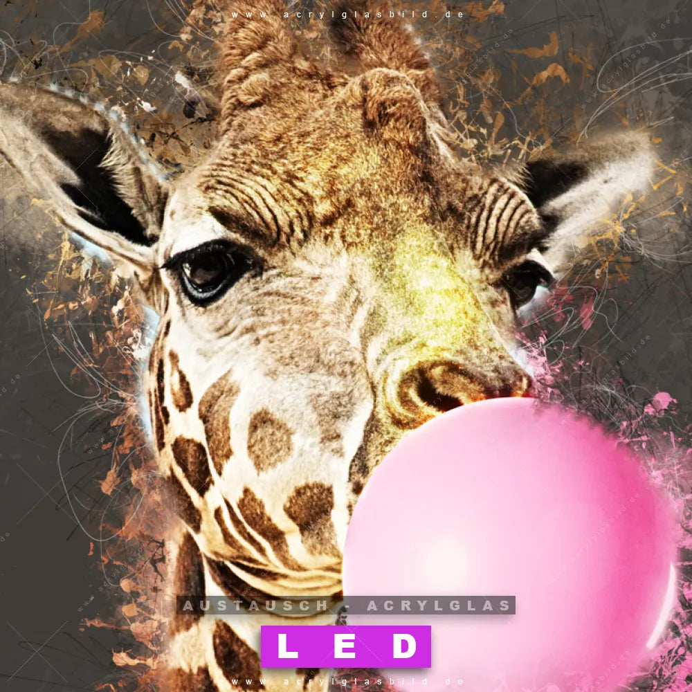 Begriffe wie Tier, Giraffe, Kaugummi, Bubble Gum, lustig, Kunst, Ballon, Luftballon haben dich auf der Suche nach deinem neuen Austausch-Acrylglasbild inspiriert? Dann sollte das Wechsel-Acrylglasbild Giraffe bläst Kaugummiblase für dein bereits vorhandenes LED Acrylglasbild Canvalight® DIA den Weg zu dir finden.