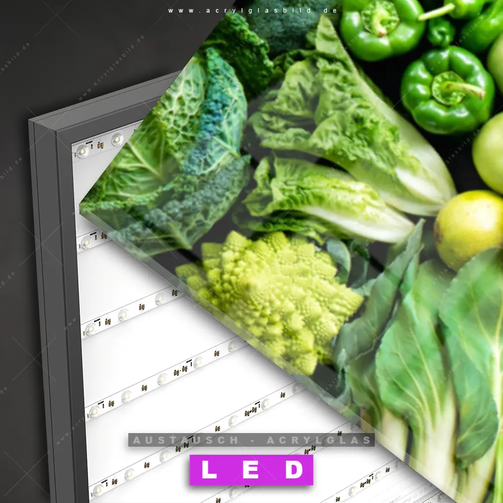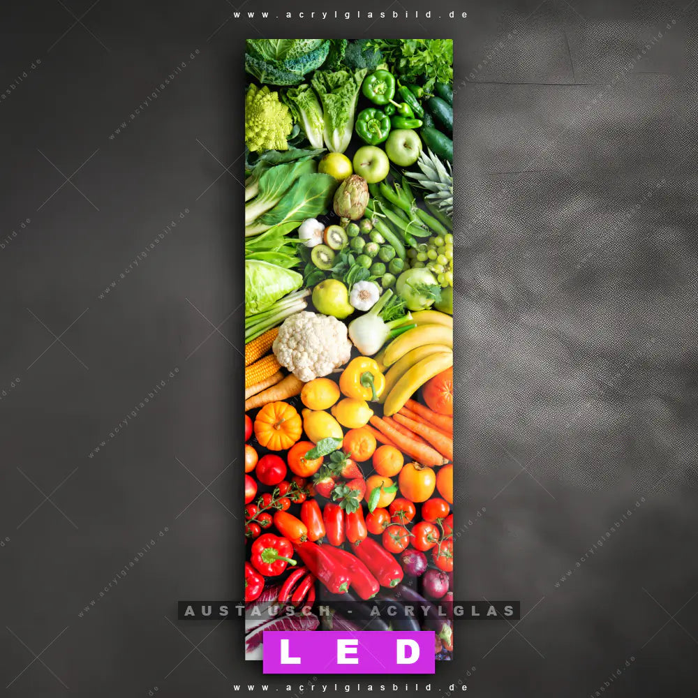 Begriffe wie Gemüse, Essen, gesund, Nahrung, Lebensmittel, Ernährung, Küche, Kochen, Gesundheit, Obst, Früchte haben dich auf der Suche nach deinem neuen Austausch-Acrylglasbild inspiriert? Dann sollte das Wechsel-Acrylglasbild Bunte Vitaminreiche Lebensmittel für dein bereits vorhandenes LED Acrylglasbild Canvalight® DIA den Weg zu dir finden.