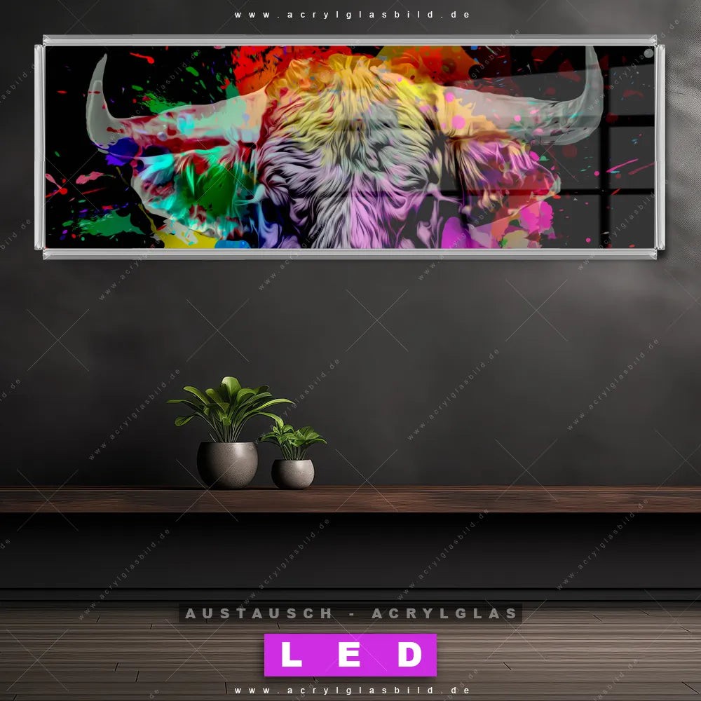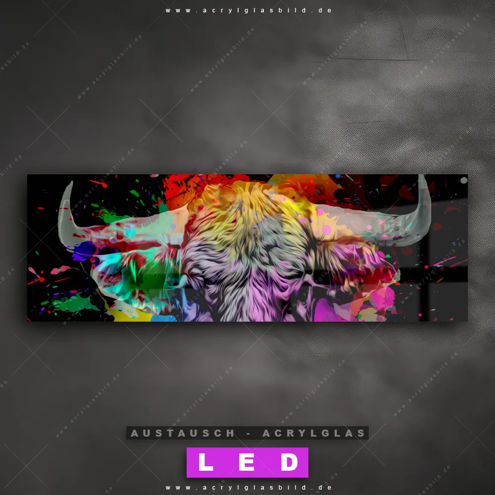 Begriffe wie Tier, Stier, Hochlandkuh, Highlander, Büffel, Splash, Farbspritzer, Rind haben dich auf der Suche nach deinem neuen Austausch-Acrylglasbild inspiriert? Dann sollte das Wechsel-Acrylglasbild Stierkopf bunt für dein bereits vorhandenes LED Acrylglasbild Canvalight® DIA den Weg zu dir finden.