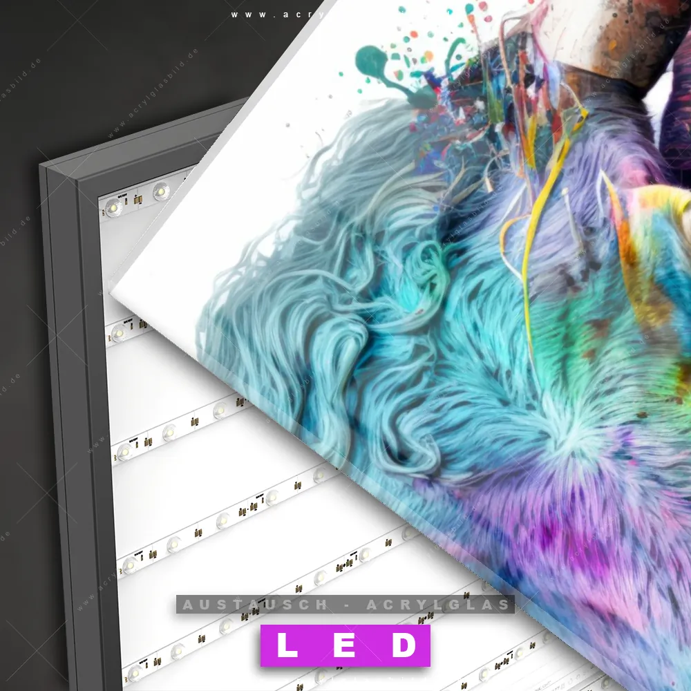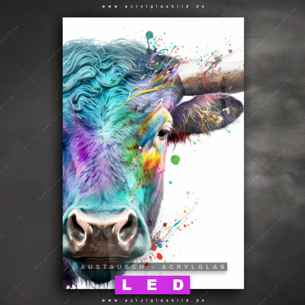Begriffe wie Tier, Stier, Hochlandkuh, Büffel, Farbspritzer, Rind, Bulle, Farbe haben dich auf der Suche nach deinem neuen Austausch-Acrylglasbild inspiriert? Dann sollte das Wechsel-Acrylglasbild Porträt eines männlichen Rindes für dein bereits vorhandenes LED Acrylglasbild Canvalight® DIA den Weg zu dir finden.