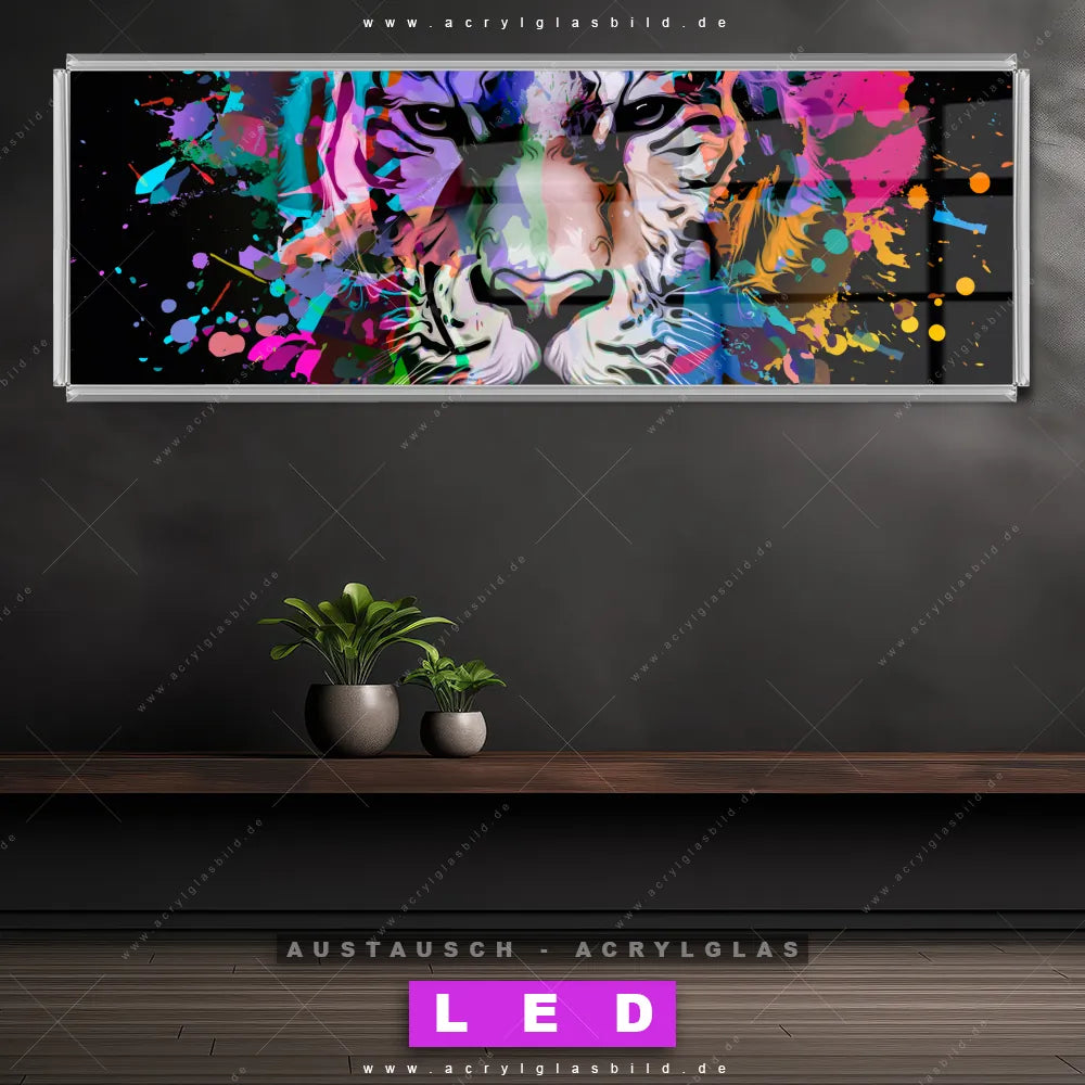 Begriffe wie Raubkatze, Tiger, Afrika, Dschungel, Splash, Farbspritzer, Farbexplosion, Farbe, Porträt haben dich auf der Suche nach deinem neuen Austausch-Acrylglasbild inspiriert? Dann sollte das Wechsel-Acrylglasbild Tiger in Farbvielfalt für dein bereits vorhandenes LED Acrylglasbild Canvalight® DIA den Weg zu dir finden.
