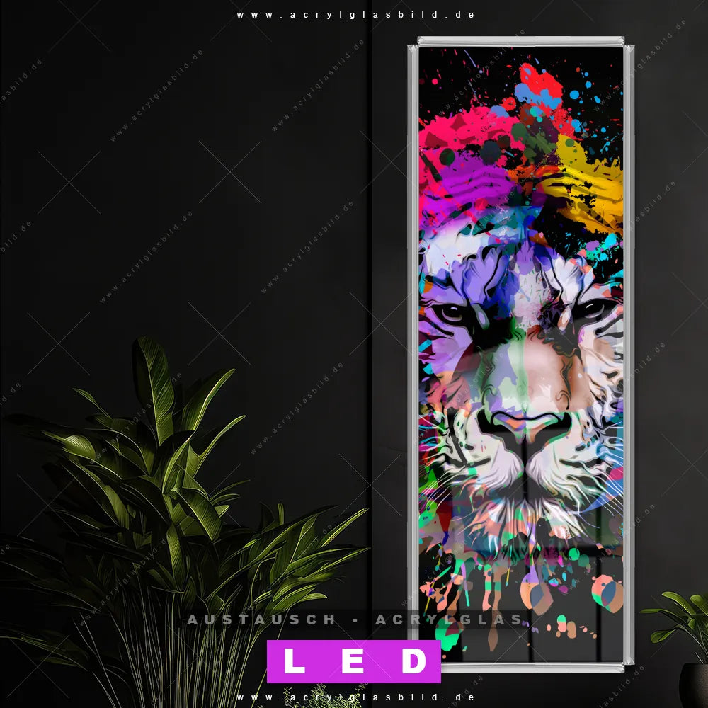 Begriffe wie Raubkatze, Tiger, Afrika, Dschungel, Splash, Farbspritzer, Farbexplosion, Farbe, Porträt haben dich auf der Suche nach deinem neuen Austausch-Acrylglasbild inspiriert? Dann sollte das Wechsel-Acrylglasbild Tiger in Farbvielfalt für dein bereits vorhandenes LED Acrylglasbild Canvalight® DIA den Weg zu dir finden.