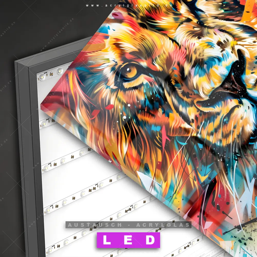 Begriffe wie Raubkatze, Löwe, Afrika, Dschungel, Lion, Graffiti, Raubtier, Löwenkopf, Wildtier, Farbexplosion, Farbspritzer, Farbe, Tierporträt haben dich auf der Suche nach deinem neuen Austausch-Acrylglasbild inspiriert? Dann sollte das Wechsel-Acrylglasbild Löwe Graffiti Kunst für dein bereits vorhandenes LED Acrylglasbild Canvalight® DIA den Weg zu dir finden.
