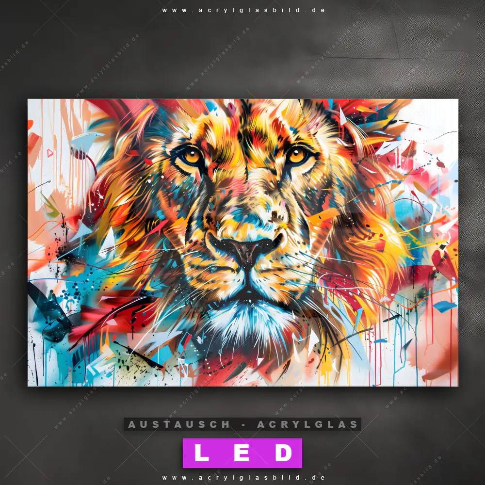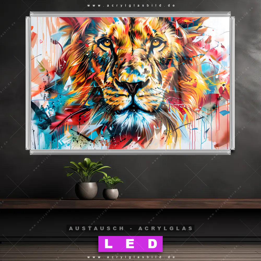 Begriffe wie Raubkatze, Löwe, Afrika, Dschungel, Lion, Graffiti, Raubtier, Löwenkopf, Wildtier, Farbexplosion, Farbspritzer, Farbe, Tierporträt haben dich auf der Suche nach deinem neuen Austausch-Acrylglasbild inspiriert? Dann sollte das Wechsel-Acrylglasbild Löwe Graffiti Kunst für dein bereits vorhandenes LED Acrylglasbild Canvalight® DIA den Weg zu dir finden.