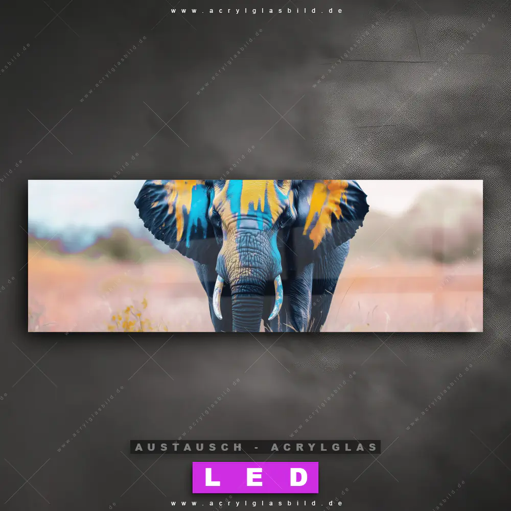 Begriffe wie Elefant, Safarie, Afrika, Big Five, Dickhäuter, Stoßzahn, Natur, Freiheit haben dich auf der Suche nach deinem neuen Austausch-Acrylglasbild inspiriert? Dann sollte das Wechsel-Acrylglasbild Elefant im Farbenrausch für dein bereits vorhandenes LED Acrylglasbild Canvalight® DIA den Weg zu dir finden.
