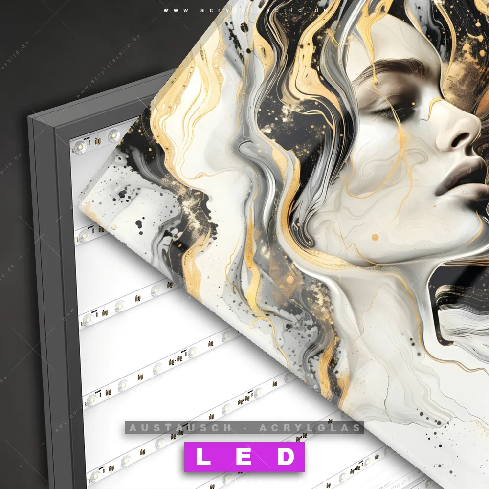 Begriffe wie Frau, Gesicht, Fluid Art haben dich auf der Suche nach deinem neuen Austausch-Acrylglasbild inspiriert? Dann sollte das Wechsel-Acrylglasbild Modernes Porträt in Gold für dein bereits vorhandenes LED Acrylglasbild Canvalight® DIA den Weg zu dir finden.