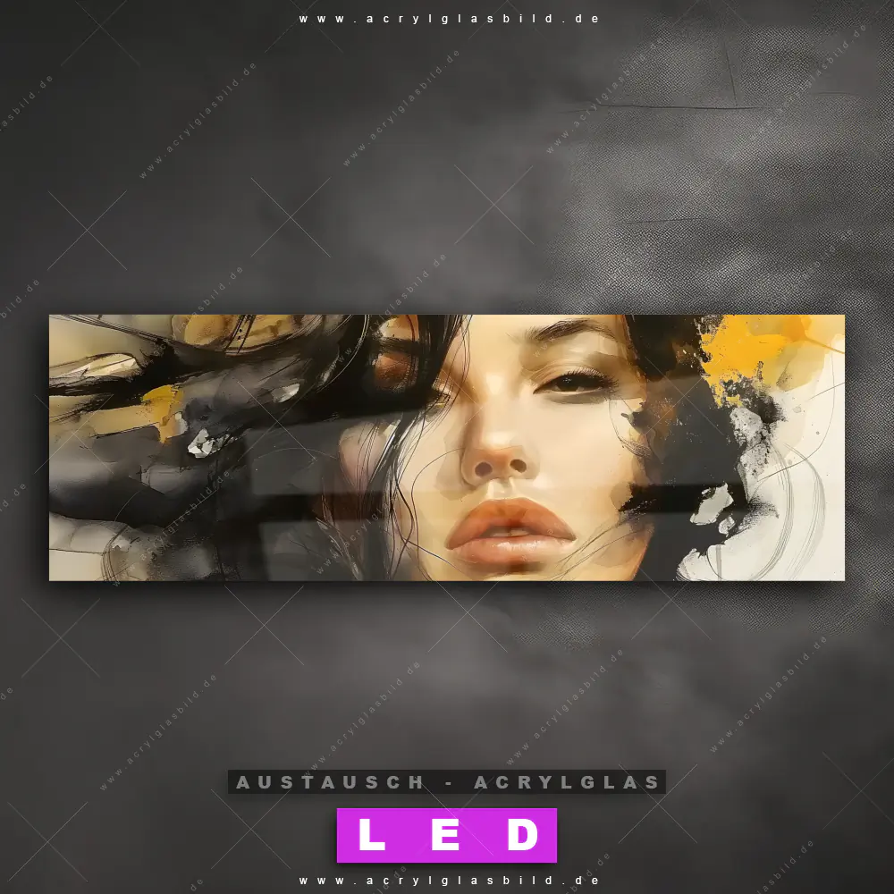 Begriffe wie Abstrakt, Modern, Kunst, Gemälde, Ölfarbe, Frau, Portrait, Lippen, Aquarell, Farbspritzer haben dich auf der Suche nach deinem neuen Austausch-Acrylglasbild inspiriert? Dann sollte das Wechsel-Acrylglasbild Abstrakte Schönheit in Gelb & Schwarz für dein bereits vorhandenes LED Acrylglasbild Canvalight® DIA den Weg zu dir finden.
