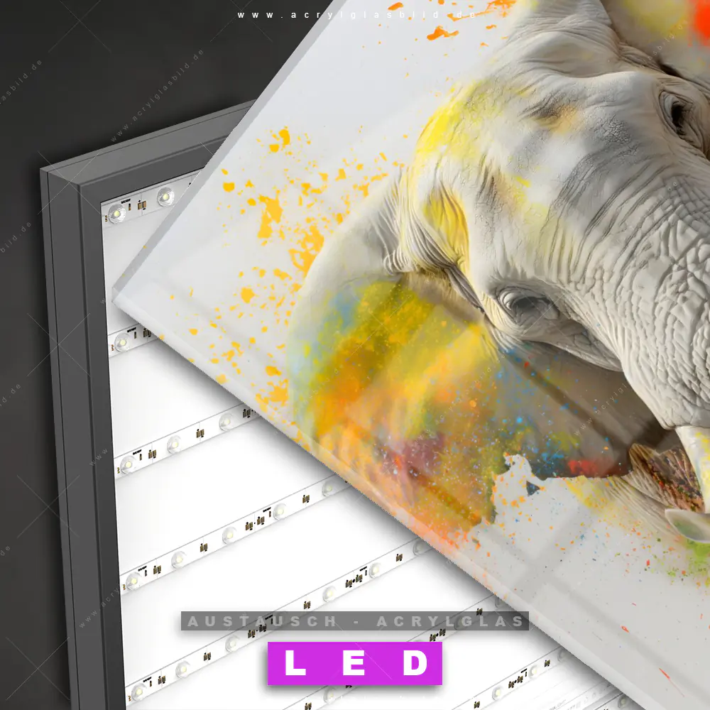 Begriffe wie Elefant, Afrika, Big Five, Dickhäuter, Stoßzahn, Farbspritzer, Farbwolke, Dschungel haben dich auf der Suche nach deinem neuen Austausch-Acrylglasbild inspiriert? Dann sollte das Wechsel-Acrylglasbild Farbenfroher Elefant für dein bereits vorhandenes LED Acrylglasbild Canvalight® DIA den Weg zu dir finden.
