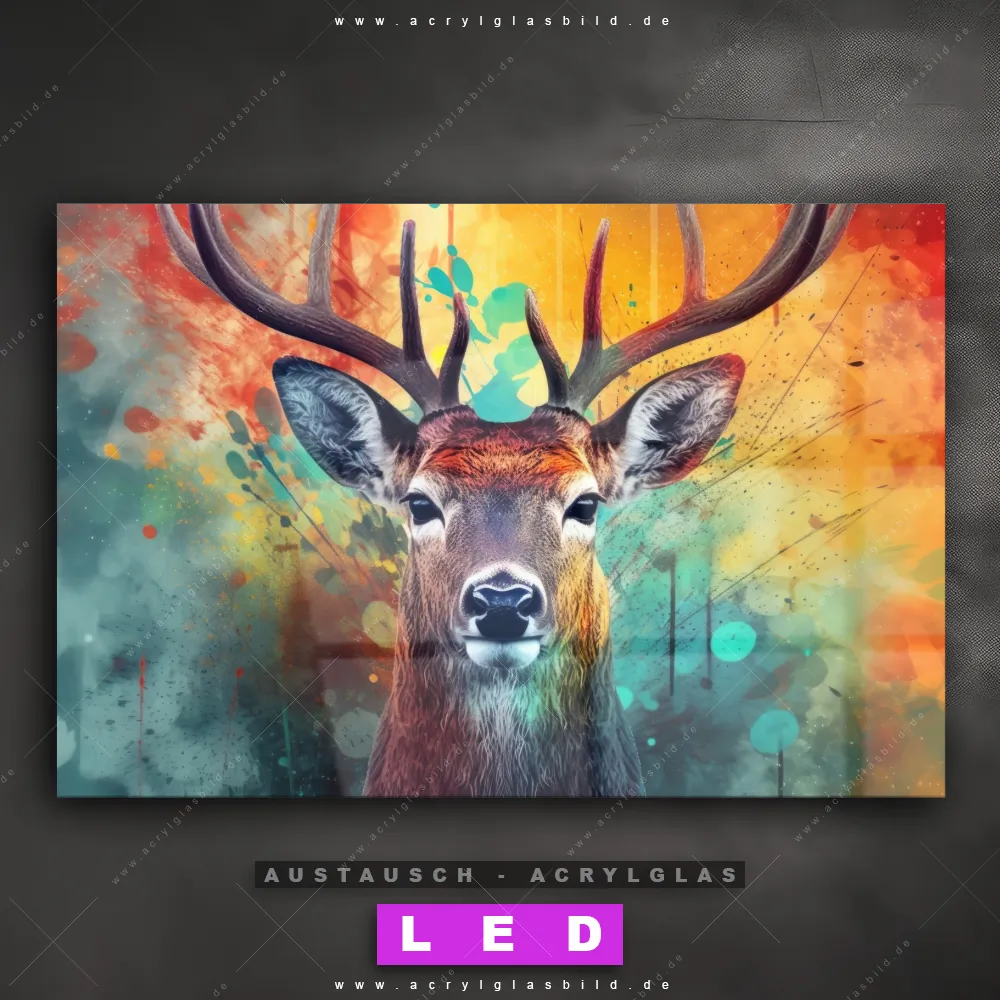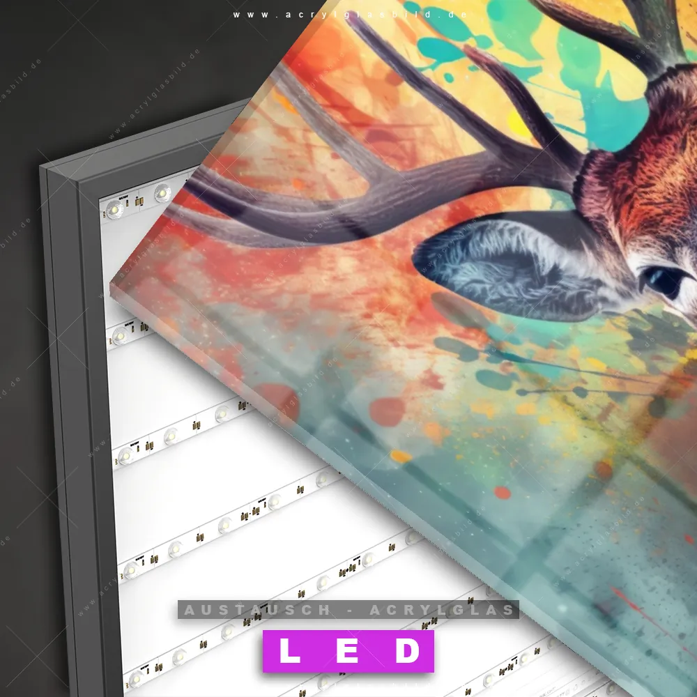 Begriffe wie Hirsch, Deer, Wald, Rotwild, Reh, Laub, Herbst haben dich auf der Suche nach deinem neuen Austausch-Acrylglasbild inspiriert? Dann sollte das Wechsel-Acrylglasbild Hirsch mit buntem Hintergrund für dein bereits vorhandenes LED Acrylglasbild Canvalight® DIA den Weg zu dir finden.