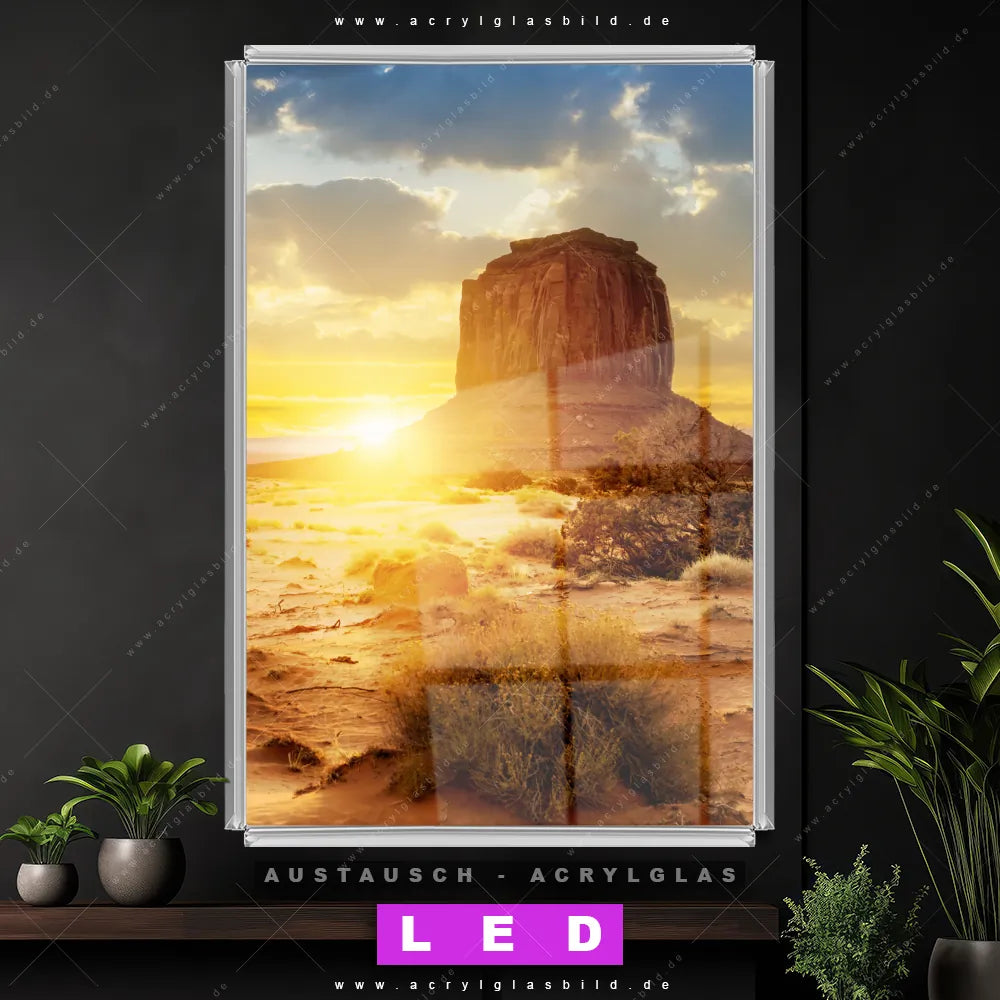 Begriffe wie Sehenswürdigkeit, USA, Landschaft, Sonnenuntergang, Steine, Felsen haben dich auf der Suche nach deinem neuen Austausch-Acrylglasbild inspiriert? Dann sollte das Wechsel-Acrylglasbild Monument Valley Felsen in der Abendsonne für dein bereits vorhandenes LED Acrylglasbild Canvalight® DIA den Weg zu dir finden.