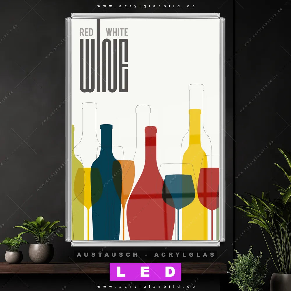 Begriffe wie Küche, Wein, Gläser, genießen, Alkohol, Rotwein, Flaschen, modern, Cocktailkirsche, Sekt, Martinigläser, Obst haben dich auf der Suche nach deinem neuen Austausch-Acrylglasbild inspiriert? Dann sollte das Wechsel-Acrylglasbild Weinflaschen und Weingläser für dein bereits vorhandenes LED Acrylglasbild Canvalight® DIA den Weg zu dir finden.
