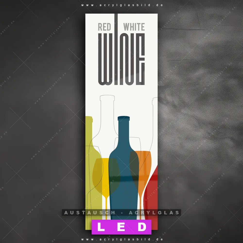 Begriffe wie Küche, Wein, Gläser, genießen, Alkohol, Rotwein, Flaschen, modern, Cocktailkirsche, Sekt, Martinigläser, Obst haben dich auf der Suche nach deinem neuen Austausch-Acrylglasbild inspiriert? Dann sollte das Wechsel-Acrylglasbild Weinflaschen und Weingläser für dein bereits vorhandenes LED Acrylglasbild Canvalight® DIA den Weg zu dir finden.