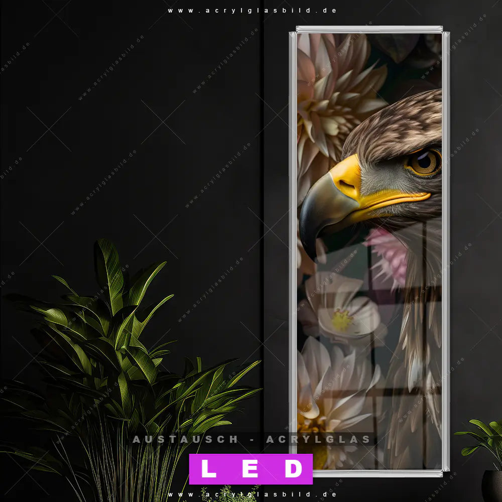 Begriffe wie Vogel, Adler, Natur, Blumen, Blüten, Greifvogel, Pfingstrosen, Dahlien haben dich auf der Suche nach deinem neuen Austausch-Acrylglasbild inspiriert? Dann sollte das Wechsel-Acrylglasbild Adler und Blumenpracht für dein bereits vorhandenes LED Acrylglasbild Canvalight® DIA den Weg zu dir finden.