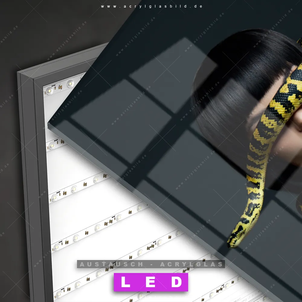 Begriffe wie Frau, Lippen, Mund, Porträt, Erotik, modern, Schlange, Python, Tier haben dich auf der Suche nach deinem neuen Austausch-Acrylglasbild inspiriert? Dann sollte das Wechsel-Acrylglasbild Schöne Frau und pythongelbe Schlange für dein bereits vorhandenes LED Acrylglasbild Canvalight® DIA den Weg zu dir finden.