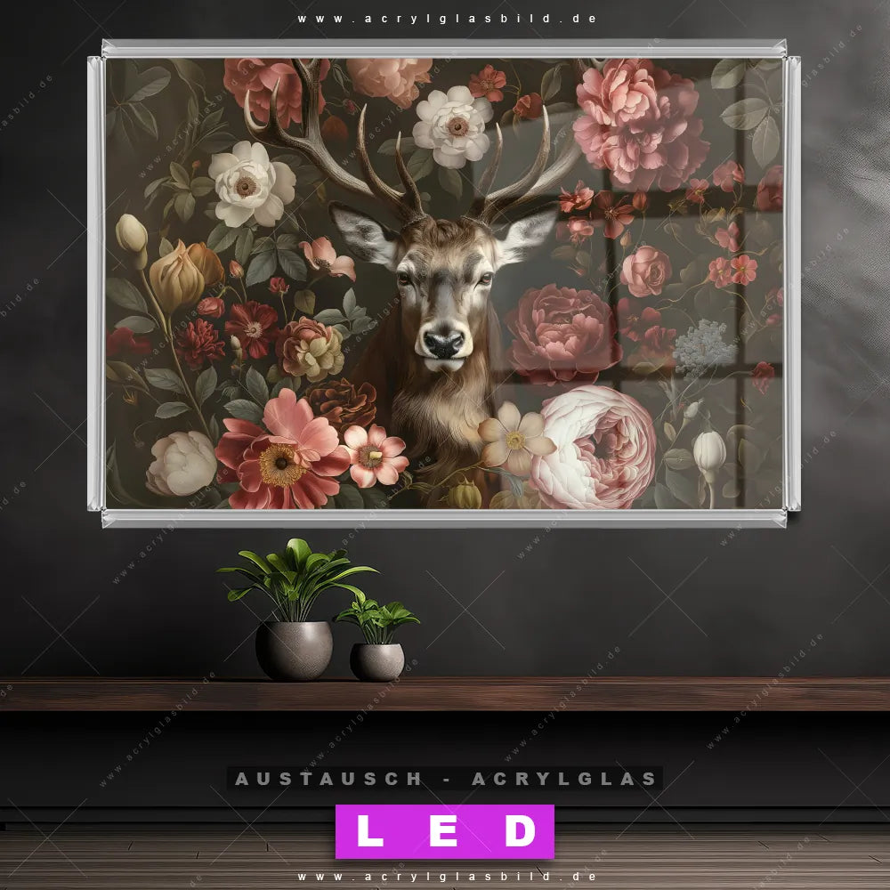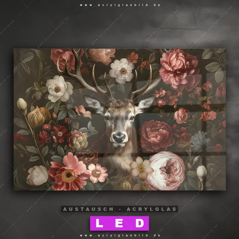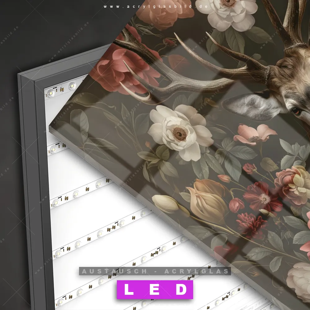 Begriffe wie Tierporträt, Hirsch, Blüten, Rotwild, Geweih, Blumen, Rothirsch, Pfingstrosen haben dich auf der Suche nach deinem neuen Austausch-Acrylglasbild inspiriert? Dann sollte das Wechsel-Acrylglasbild Florales Hirsch-Porträt für dein bereits vorhandenes LED Acrylglasbild Canvalight® DIA den Weg zu dir finden.