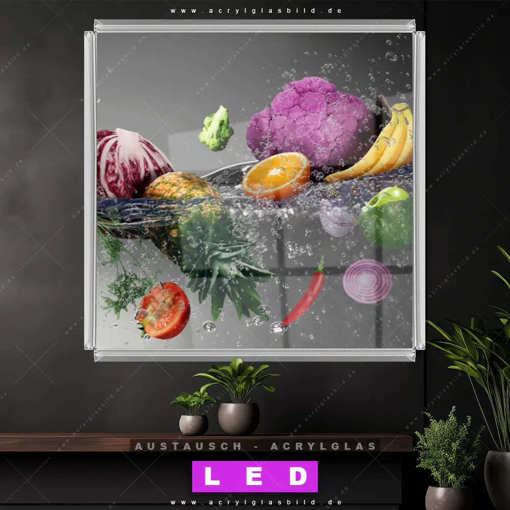 Begriffe wie Obst, Zitrusfrüchte, Früchte, Banane, Ananas, Spritzwasser, Wasser, Spritzer, Tropfen, Wassertropfen, Ernährung, Gesundheit, Lebensmittel haben dich auf der Suche nach deinem neuen Austausch-Acrylglasbild inspiriert? Dann sollte das Wechsel-Acrylglasbild Gemüse im Wasserstrahl für dein bereits vorhandenes LED Acrylglasbild Canvalight® DIA den Weg zu dir finden.