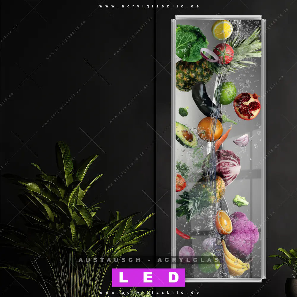 Begriffe wie Obst, Zitrusfrüchte, Früchte, Banane, Ananas, Spritzwasser, Wasser, Spritzer, Tropfen, Wassertropfen, Ernährung, Gesundheit, Lebensmittel haben dich auf der Suche nach deinem neuen Austausch-Acrylglasbild inspiriert? Dann sollte das Wechsel-Acrylglasbild Gemüse im Wasserstrahl für dein bereits vorhandenes LED Acrylglasbild Canvalight® DIA den Weg zu dir finden.